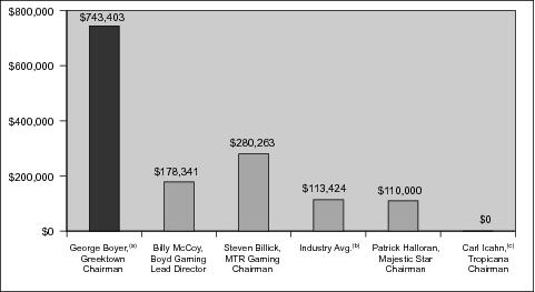 We believe George Boyer’s ability to properly address the issues facing the Company is compromised by the misalignment between his compensation and the Company’s performance. Despite being the only single asset company in this comparison, the Company compensates Mr. Boyer substantially more than the Chairman or Lead Director of other regional gaming companies. Mr. Boyer’s compensation is outrageous by any standard, but particularly for a Chairman who has destroyed equity value under his tenure while residing in Las Vegas and spending limited time in Detroit.