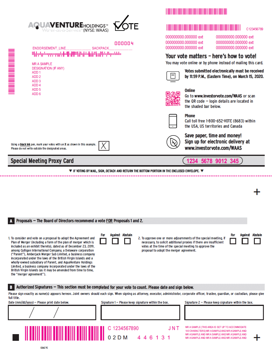 MMMMMMMMMMMM MMMMMMMMMMMMMMM C123456789 000000000.000000 ext 000000000.000000 ext 000000000.000000 ext 000000000.000000 ext 000000000.000000 ext 000000000.000000 ext 000004 ENDORSEMENT_LINE______________ SACKPACK_____________ Your vote matters – here’s how to vote! You may vote online or by phone instead of mailing this card. Votes submitted electronically must be received MR A SAMPLE DESIGNATION (IF ANY) ADD 1 ADD 2 ADD 3 ADD 4 ADD 5 ADD 6 by 11:59 P.M., (Eastern Time), on March 15, 2020. Online GIof ntoo welwewct.rinovneicstvoortviontge,.com/WAAS or scan delete QR code and control # the QR code — login details are located in the shaded bar below. Phone Call toll free 1-800-652-VOTE (8683) within the USA, US territories and Canada Save paper, time and money! Sign up for electronic delivery at www.investorvote.com/WAAS Using a black ink pen, mark your votes with an X as shown in this example. Please do not write outside the designated areas. q IF VOTING BY MAIL, SIGN, DETACH AND RETURN THE BOTTOM PORTION IN THE ENCLOSED ENVELOPE. q + For Against Abstain For Against Abstain 1. To consider and vote on a proposal to adopt the Agreement and Plan of Merger (including a form of the plan of merger which is included as an exhibit thereto), dated as of December 23, 2019, among Culligan International Company, a Delaware corporation (“Parent”), Amberjack Merger Sub Limited, a business company incorporated under the laws of the British Virgin Islands and a wholly-owned subsidiary of Parent, and AquaVenture Holdings Limited, a business company incorporated under the laws of the British Virgin Islands (as it may be amended from time to time, the “merger agreement”). 2. To approve one or more adjournments of the special meeting, if necessary, to solicit additional proxies if there are insufficient votes at the time of the special meeting to approve the proposal to adopt the merger agreement. Please sign exactly as name(s) appears hereon. Joint owners should each sign. When signing as attorney, executor, administrator, corporate officer, trustee, guardian, or custodian, please give full title. Date (mm/dd/yyyy) — Please print date below. Signature 1 — Please keep signature within the box. Signature 2 — Please keep signature within the box. MMMMMMM C 1234567890 J N T 4 6 1 3 1 MR A SAMPLE (THIS AREA IS SET UP TO ACCOMMODATE 140 CHARACTERS) MR A SAMPLE AND MR A SAMPLE AND MR A SAMPLE AND MR A SAMPLE AND MR A SAMPLE AND MR A SAMPLE AND MR A SAMPLE AND MR A SAMPLE AND + 0 2 D M 4 036CYE MMMMMMMMM B Authorized Signatures — This section must be completed for your vote to count. Please date and sign below. A Proposals — The Board of Directors recommend a vote FOR Proposals 1 and 2. Special Meeting Proxy Card1234 5678 9012 345