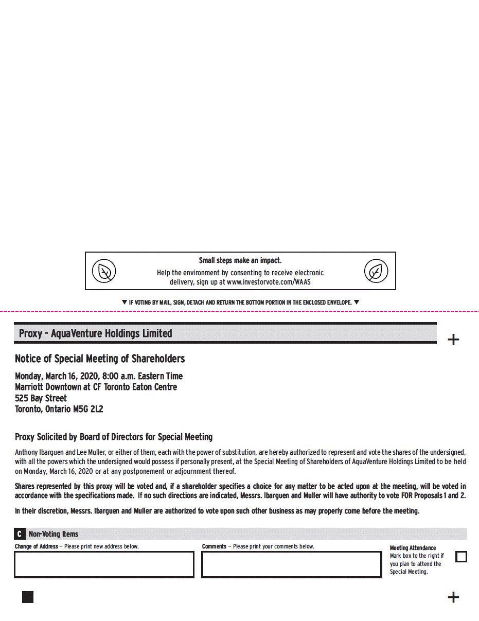 q IF VOTING BY MAIL, SIGN, DETACH AND RETURN THE BOTTOM PORTION IN THE ENCLOSED ENVELOPE. q + Notice of Special Meeting of Shareholders Monday, March 16, 2020, 8:00 a.m. Eastern Time Marriott Downtown at CF Toronto Eaton Centre 525 Bay Street Toronto, Ontario M5G 2L2 Proxy Solicited by Board of Directors for Special Meeting Anthony Ibarguen and Lee Muller, or either of them, each with the power of substitution, are hereby authorized to represent and vote the shares of the undersigned, with all the powers which the undersigned would possess if personally present, at the Special Meeting of Shareholders of AquaVenture Holdings Limited to be held on Monday, March 16, 2020 or at any postponement or adjournment thereof. Shares represented by this proxy will be voted and, if a shareholder specifies a choice for any matter to be acted upon at the meeting, will be voted in accordance with the specifications made. If no such directions are indicated, Messrs. Ibarguen and Muller will have authority to vote FOR Proposals 1 and 2. In their discretion, Messrs. Ibarguen and Muller are authorized to vote upon such other business as may properly come before the meeting. Change of Address — Please print new address below. Comments — Please print your comments below. Meeting Attendance Mark box to the right if you plan to attend the Special Meeting. + C Non-Voting Items Proxy - AquaVenture Holdings Limited Small steps make an impact. Help the environment by consenting to receive electronic delivery, sign up at www.investorvote.com/WAAS