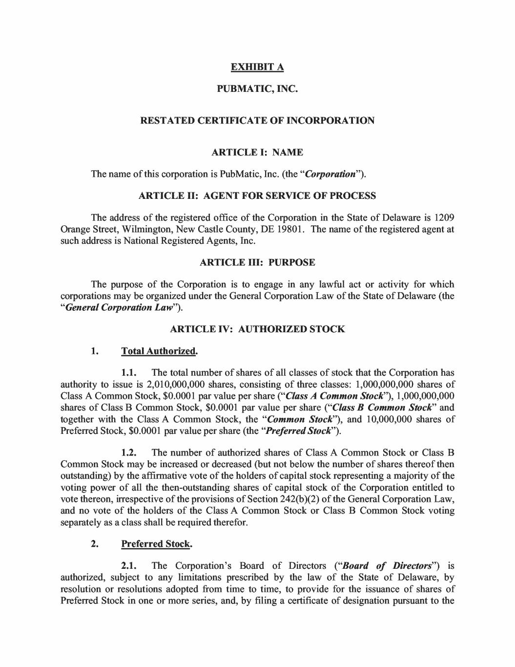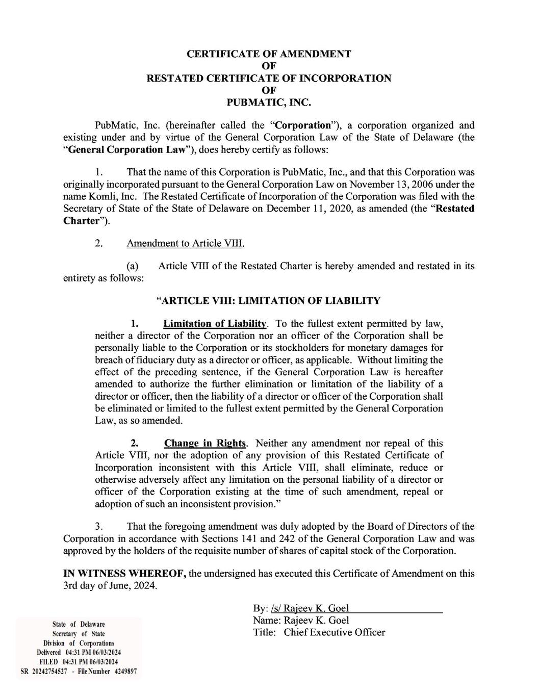 Delaware The First State Page 1 4249897 8100X Authentication: 203030465 SR# 20250765681 Date: 02-26-25 You may verify this certificate online at corp.delaware.gov/authver.shtml I, CHARUNI PATIBANDA-SANCHEZ, SECRETARY OF STATE OF THE STATE OF DELAWARE, DO HEREBY CERTIFY THE ATTACHED ARE TRUE AND CORRECT COPIES OF ALL DOCUMENTS FILED FROM AND INCLUDING THE RESTATED CERTIFICATE OR A MERGER WITH A RESTATED CERTIFICATE ATTACHED OF “PUBMATIC, INC.” AS RECEIVED AND FILED IN THIS OFFICE. THE FOLLOWING DOCUMENTS HAVE BEEN CERTIFIED: RESTATED CERTIFICATE, FILED THE ELEVENTH DAY OF DECEMBER, A.D. 2020, AT 8:01 O`CLOCK A.M. CERTIFICATE OF AMENDMENT, FILED THE THIRD DAY OF JUNE, A.D. 2024, AT 4:31 O`CLOCK P.M.