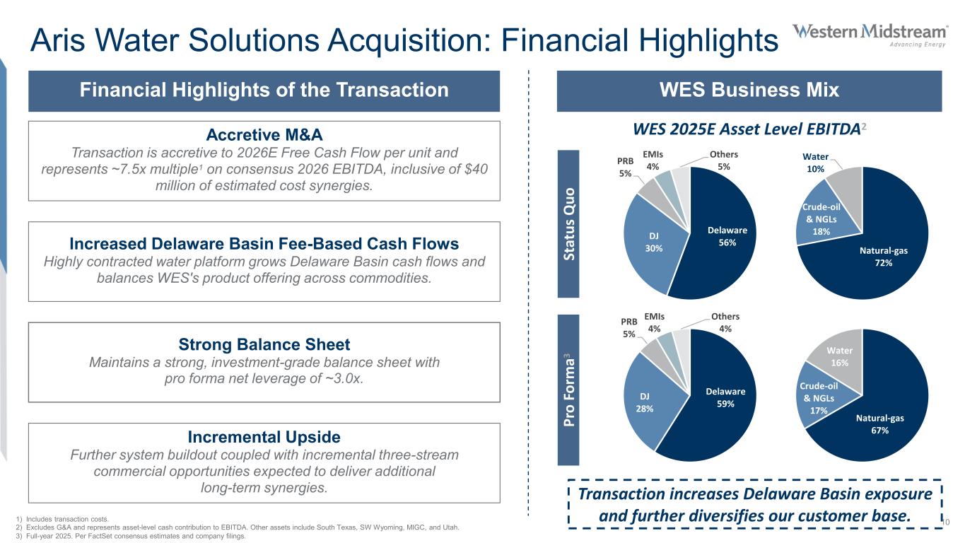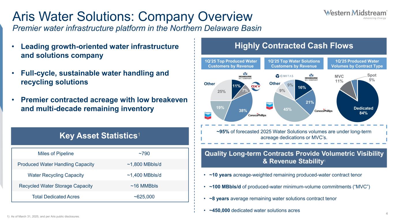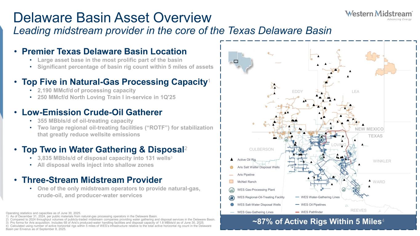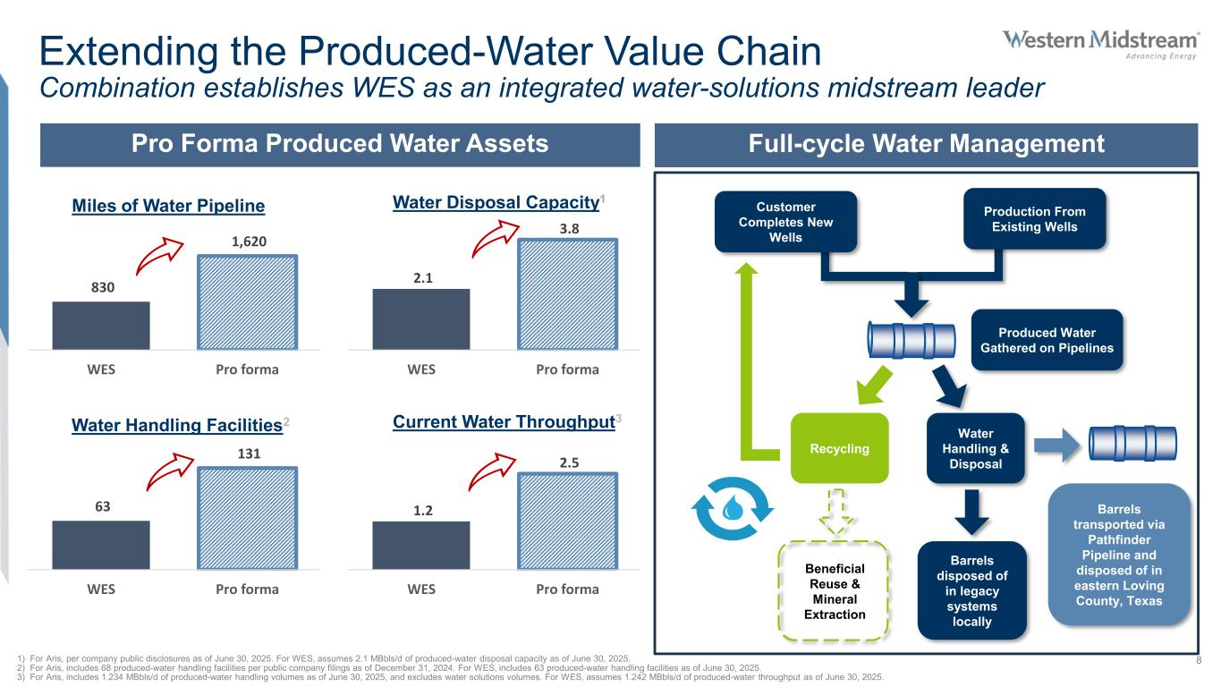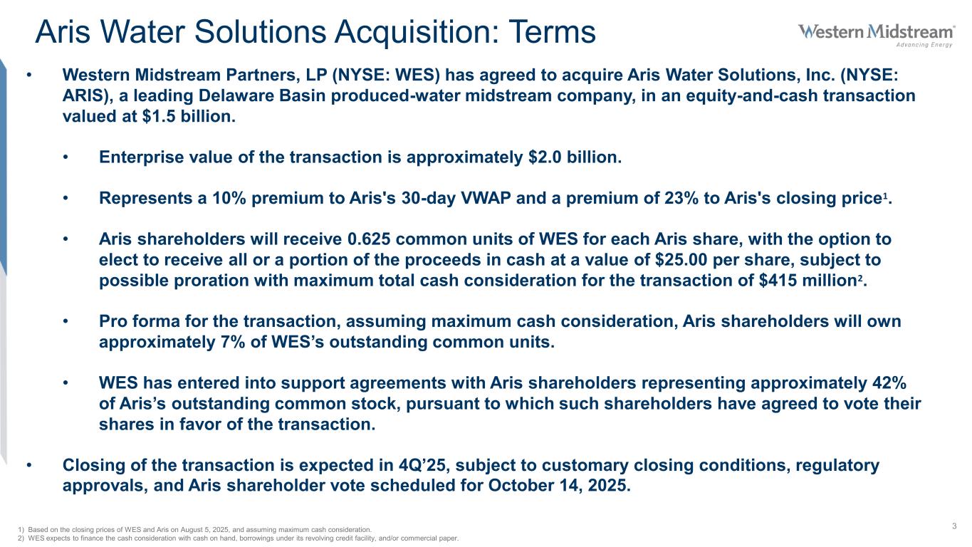 2 No Offer or Solicitation This communication relates to a proposed business combination transaction (the “Transaction”) between Western Midstream Partners, LP (“WES”) and Aris Water Solutions, Inc. (“Aris”). This communication is for informational purposes only and does not constitute an offer to buy or sell or the solicitation of an offer to buy or sell any securities or a solicitation of any vote or approval, in any jurisdiction, pursuant to the Transaction or otherwise, nor shall there be any sale, issuance, exchange or transfer of the securities referred to in this document in any jurisdiction in contravention of applicable law. No offer of securities shall be made except by means of a prospectus meeting the requirements of Section 10 of the Securities Act of 1933, as amended. Important Additional Information and Where to Find It In connection with the Transaction, WES filed with the U.S. Securities and Exchange Commission (“SEC”) a registration statement on Form S-4 that includes a proxy statement of Aris that also constitutes a prospectus of WES. The registration statement was declared effective by the SEC on September 12, 2025. WES filed a final prospectus on September 12, 2025, and Aris filed a definitive proxy statement/prospectus on September 12, 2025. The Transaction will be submitted to Aris’s stockholders for their consideration at a special meeting on October 14, 2025. WES and Aris may also file other documents with the SEC regarding the Transaction. The definitive proxy statement/prospectus was first mailed to Aris's stockholders on September 12, 2025. This document is not a substitute for the registration statement and proxy statement/prospectus that was filed with the SEC or any other documents that WES or Aris have filed or may file with the SEC or send to security holders of WES or Aris in connection with the Transaction. BEFORE MAKING ANY VOTING OR INVESTMENT DECISION, INVESTORS AND SECURITY HOLDERS OF WES AND ARIS ARE URGED TO READ THE REGISTRATION STATEMENT AND THE PROXY STATEMENT/PROSPECTUS REGARDING THE TRANSACTION AND ALL OTHER RELEVANT DOCUMENTS THAT ARE FILED OR WILL BE FILED WITH THE SEC, AS WELL AS ANY AMENDMENTS OR SUPPLEMENTS TO THESE DOCUMENTS, CAREFULLY AND IN THEIR ENTIRETY IF AND WHEN THEY BECOME AVAILABLE BECAUSE THEY CONTAIN OR WILL CONTAIN IMPORTANT INFORMATION ABOUT THE TRANSACTION AND RELATED MATTERS. Investors and security holders can obtain free copies of the registration statement and the proxy statement/prospectus and all other documents filed or that will be filed with the SEC by WES or Aris through the website maintained by the SEC at http://www.sec.gov. Copies of documents filed with the SEC by WES will be made available free of charge on WES’s website at investors.westernmidstream.com, or by directing a request to Investor Relations, Western Midstream Partners, LP, 9950 Woodloch Forest Drive, Suite 2800, The Woodlands, TX 77380, Tel. No. (832) 636-1009. Copies of documents filed with the SEC by Aris will be made available free of charge on Aris’s website at ir.ariswater.com or by directing a request to Investor Relations, Aris Water Solutions, Inc., 9651 Katy Freeway, Suite 400, Houston, TX 77024, Tel. No. (832) 304-7003. Participants in the Solicitation WES, its general partner and its general partner’s director and officers and Aris and its directors and executive officers may be deemed to be participants in the solicitation of proxies in respect of the Transaction. Information regarding directors and executive officers of WES’s general partner, including a description of their direct or indirect interests, by security holdings or otherwise, is set forth (i) in WES’s Annual Report on Form 10-K for the year ended December 31, 2024, including under Part III, Item 10. Directors, Executive Officers, and Corporate Governance, Part III, Item 12. Security Ownership of Certain Beneficial Owners and Management and Related Stockholder Matters and Part III, Item 13. Certain Relationships and Related Transactions, and Director Independence, which was filed with the SEC on February 26, 2025 and is available at https://www.sec.gov/ix?doc=/Archives/edgar/data/0001423902/000142390225000033/wes-20241231.htm and (ii) to the extent holdings of WES’s securities by the directors or executive officers of its general partner have changed since the amounts set forth in WES’s Annual Report on Form 10-K for the year ended December 31, 2024, such changes have been or will be reflected on Initial Statement of Beneficial Ownership of Securities on Form 3, Statement of Changes in Beneficial Ownership on Form 4, or Annual Statement of Changes in Beneficial Ownership on Form 5 filed with the SEC, which are available at https://www.sec.gov/cgi-bin/own-disp?action=getissuer&CIK=0001423902. Information regarding Aris’s executive officers and directors, including a description of their direct or indirect interests, by security holdings or otherwise, is set forth (i) in Aris’s definitive proxy statement for its 2025 Annual Meeting of Stockholders, including under the headings “Proposal One — Election of Directors,” “Executive Officers,” “Executive Compensation,” “Certain Relationships and Related Party Transactions” and “Beneficial Ownership of Securities,” which was filed with the SEC on April 9, 2025 and is available at https://www.sec.gov/Archives/edgar/data/1865187/000119312525076892/d881669ddef14a.htm, and Aris’s Annual Report on Form 10-K for the year ended December 31, 2024, which was filed with the SEC on February 27, 2025 and is available at https://www.sec.gov/ix?doc=/Archives/edgar/data/0001865187/000155837025001818/aris-20241231x10k.htm , (ii) the definitive proxy statement/prospectus, including under the headings "Interest's of Aris's Directors and Executive Officers in the Mergers" beginning on pages 17 and 72, which was filed with the SEC on September 12, 2025 and is available at https://www.sec.gov/