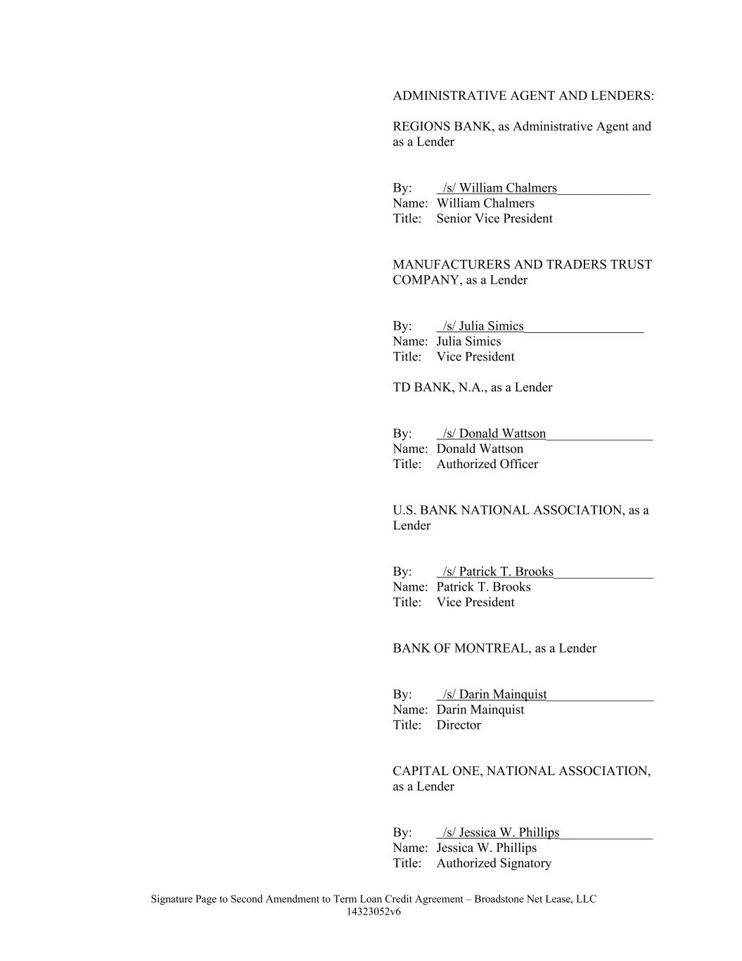 Signature Page to Second Amendment to Term Loan Credit Agreement – Broadstone Net Lease, LLC 14323052v6 ADMINISTRATIVE AGENT AND LENDERS: REGIONS BANK, as Administrative Agent and as a Lender By: /s/ William Chalmers______________ Name: William Chalmers Title: Senior Vice President MANUFACTURERS AND TRADERS TRUST COMPANY, as a Lender By: /s/ Julia Simics__________________ Name: Julia Simics Title: Vice President TD BANK, N.A., as a Lender By: /s/ Donald Wattson________________ Name: Donald Wattson Title: Authorized Officer U.S. BANK NATIONAL ASSOCIATION, as a Lender By: /s/ Patrick T. Brooks_______________ Name: Patrick T. Brooks Title: Vice President BANK OF MONTREAL, as a Lender By: /s/ Darin Mainquist________________ Name: Darin Mainquist Title: Director CAPITAL ONE, NATIONAL ASSOCIATION, as a Lender By: /s/ Jessica W. Phillips______________ Name: Jessica W. Phillips Title: Authorized Signatory