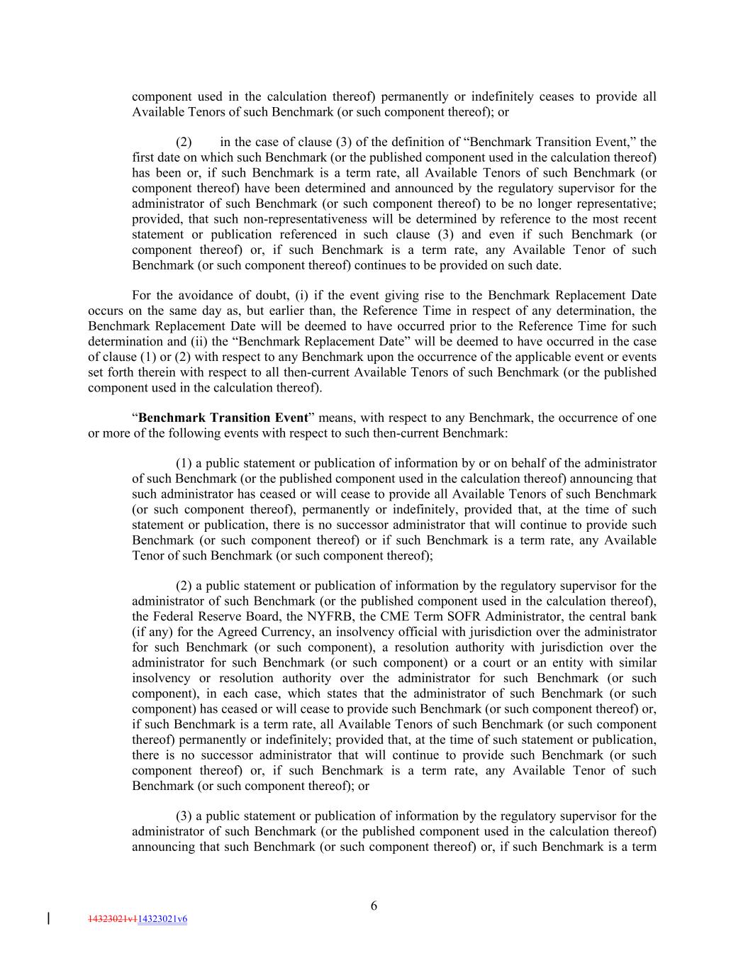 component used in the calculation thereof) permanently or indefinitely ceases to provide all Available Tenors of such Benchmark (or such component thereof); or (2) in the case of clause (3) of the definition of “Benchmark Transition Event,” the first date on which such Benchmark (or the published component used in the calculation thereof) has been or, if such Benchmark is a term rate, all Available Tenors of such Benchmark (or component thereof) have been determined and announced by the regulatory supervisor for the administrator of such Benchmark (or such component thereof) to be no longer representative; provided, that such non-representativeness will be determined by reference to the most recent statement or publication referenced in such clause (3) and even if such Benchmark (or component thereof) or, if such Benchmark is a term rate, any Available Tenor of such Benchmark (or such component thereof) continues to be provided on such date. For the avoidance of doubt, (i) if the event giving rise to the Benchmark Replacement Date occurs on the same day as, but earlier than, the Reference Time in respect of any determination, the Benchmark Replacement Date will be deemed to have occurred prior to the Reference Time for such determination and (ii) the “Benchmark Replacement Date” will be deemed to have occurred in the case of clause (1) or (2) with respect to any Benchmark upon the occurrence of the applicable event or events set forth therein with respect to all then-current Available Tenors of such Benchmark (or the published component used in the calculation thereof). “Benchmark Transition Event” means, with respect to any Benchmark, the occurrence of one or more of the following events with respect to such then-current Benchmark: (1) a public statement or publication of information by or on behalf of the administrator of such Benchmark (or the published component used in the calculation thereof) announcing that such administrator has ceased or will cease to provide all Available Tenors of such Benchmark (or such component thereof), permanently or indefinitely, provided that, at the time of such statement or publication, there is no successor administrator that will continue to provide such Benchmark (or such component thereof) or if such Benchmark is a term rate, any Available Tenor of such Benchmark (or such component thereof); (2) a public statement or publication of information by the regulatory supervisor for the administrator of such Benchmark (or the published component used in the calculation thereof), the Federal Reserve Board, the NYFRB, the CME Term SOFR Administrator, the central bank (if any) for the Agreed Currency, an insolvency official with jurisdiction over the administrator for such Benchmark (or such component), a resolution authority with jurisdiction over the administrator for such Benchmark (or such component) or a court or an entity with similar insolvency or resolution authority over the administrator for such Benchmark (or such component), in each case, which states that the administrator of such Benchmark (or such component) has ceased or will cease to provide such Benchmark (or such component thereof) or, if such Benchmark is a term rate, all Available Tenors of such Benchmark (or such component thereof) permanently or indefinitely; provided that, at the time of such statement or publication, there is no successor administrator that will continue to provide such Benchmark (or such component thereof) or, if such Benchmark is a term rate, any Available Tenor of such Benchmark (or such component thereof); or (3) a public statement or publication of information by the regulatory supervisor for the administrator of such Benchmark (or the published component used in the calculation thereof) announcing that such Benchmark (or such component thereof) or, if such Benchmark is a term 6 14323021v114323021v6