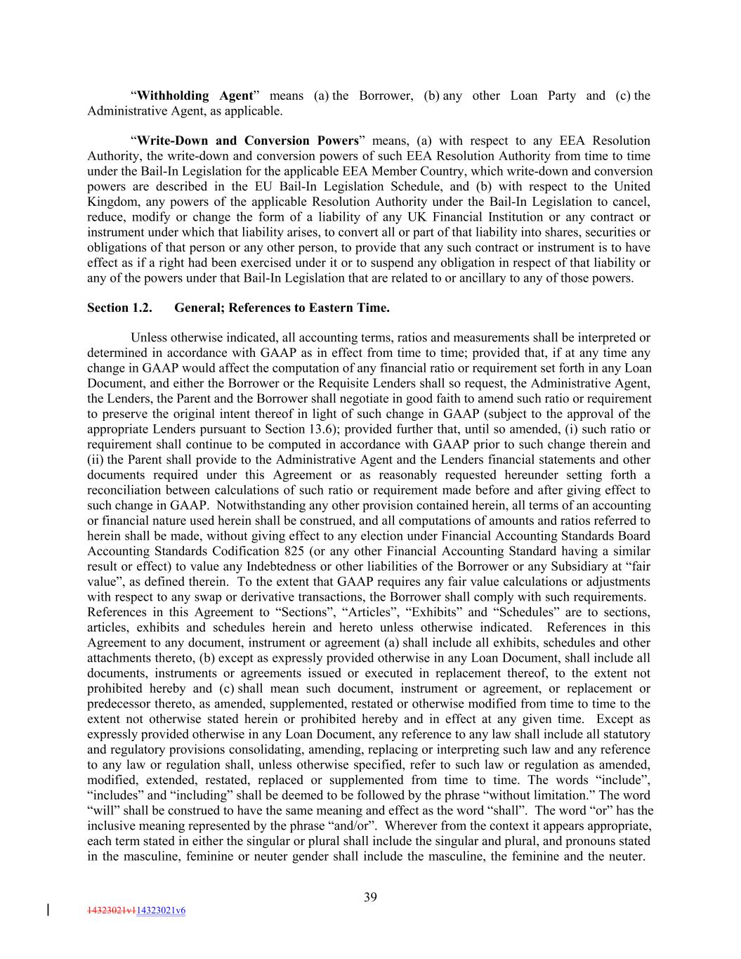“Withholding Agent” means (a) the Borrower, (b) any other Loan Party and (c) the Administrative Agent, as applicable. “Write-Down and Conversion Powers” means, (a) with respect to any EEA Resolution Authority, the write-down and conversion powers of such EEA Resolution Authority from time to time under the Bail-In Legislation for the applicable EEA Member Country, which write-down and conversion powers are described in the EU Bail-In Legislation Schedule, and (b) with respect to the United Kingdom, any powers of the applicable Resolution Authority under the Bail-In Legislation to cancel, reduce, modify or change the form of a liability of any UK Financial Institution or any contract or instrument under which that liability arises, to convert all or part of that liability into shares, securities or obligations of that person or any other person, to provide that any such contract or instrument is to have effect as if a right had been exercised under it or to suspend any obligation in respect of that liability or any of the powers under that Bail-In Legislation that are related to or ancillary to any of those powers. Section 1.2. General; References to Eastern Time. Unless otherwise indicated, all accounting terms, ratios and measurements shall be interpreted or determined in accordance with GAAP as in effect from time to time; provided that, if at any time any change in GAAP would affect the computation of any financial ratio or requirement set forth in any Loan Document, and either the Borrower or the Requisite Lenders shall so request, the Administrative Agent, the Lenders, the Parent and the Borrower shall negotiate in good faith to amend such ratio or requirement to preserve the original intent thereof in light of such change in GAAP (subject to the approval of the appropriate Lenders pursuant to Section 13.6); provided further that, until so amended, (i) such ratio or requirement shall continue to be computed in accordance with GAAP prior to such change therein and (ii) the Parent shall provide to the Administrative Agent and the Lenders financial statements and other documents required under this Agreement or as reasonably requested hereunder setting forth a reconciliation between calculations of such ratio or requirement made before and after giving effect to such change in GAAP. Notwithstanding any other provision contained herein, all terms of an accounting or financial nature used herein shall be construed, and all computations of amounts and ratios referred to herein shall be made, without giving effect to any election under Financial Accounting Standards Board Accounting Standards Codification 825 (or any other Financial Accounting Standard having a similar result or effect) to value any Indebtedness or other liabilities of the Borrower or any Subsidiary at “fair value”, as defined therein. To the extent that GAAP requires any fair value calculations or adjustments with respect to any swap or derivative transactions, the Borrower shall comply with such requirements. References in this Agreement to “Sections”, “Articles”, “Exhibits” and “Schedules” are to sections, articles, exhibits and schedules herein and hereto unless otherwise indicated. References in this Agreement to any document, instrument or agreement (a) shall include all exhibits, schedules and other attachments thereto, (b) except as expressly provided otherwise in any Loan Document, shall include all documents, instruments or agreements issued or executed in replacement thereof, to the extent not prohibited hereby and (c) shall mean such document, instrument or agreement, or replacement or predecessor thereto, as amended, supplemented, restated or otherwise modified from time to time to the extent not otherwise stated herein or prohibited hereby and in effect at any given time. Except as expressly provided otherwise in any Loan Document, any reference to any law shall include all statutory and regulatory provisions consolidating, amending, replacing or interpreting such law and any reference to any law or regulation shall, unless otherwise specified, refer to such law or regulation as amended, modified, extended, restated, replaced or supplemented from time to time. The words “include”, “includes” and “including” shall be deemed to be followed by the phrase “without limitation.” The word “will” shall be construed to have the same meaning and effect as the word “shall”. The word “or” has the inclusive meaning represented by the phrase “and/or”. Wherever from the context it appears appropriate, each term stated in either the singular or plural shall include the singular and plural, and pronouns stated in the masculine, feminine or neuter gender shall include the masculine, the feminine and the neuter. 39 14323021v114323021v6