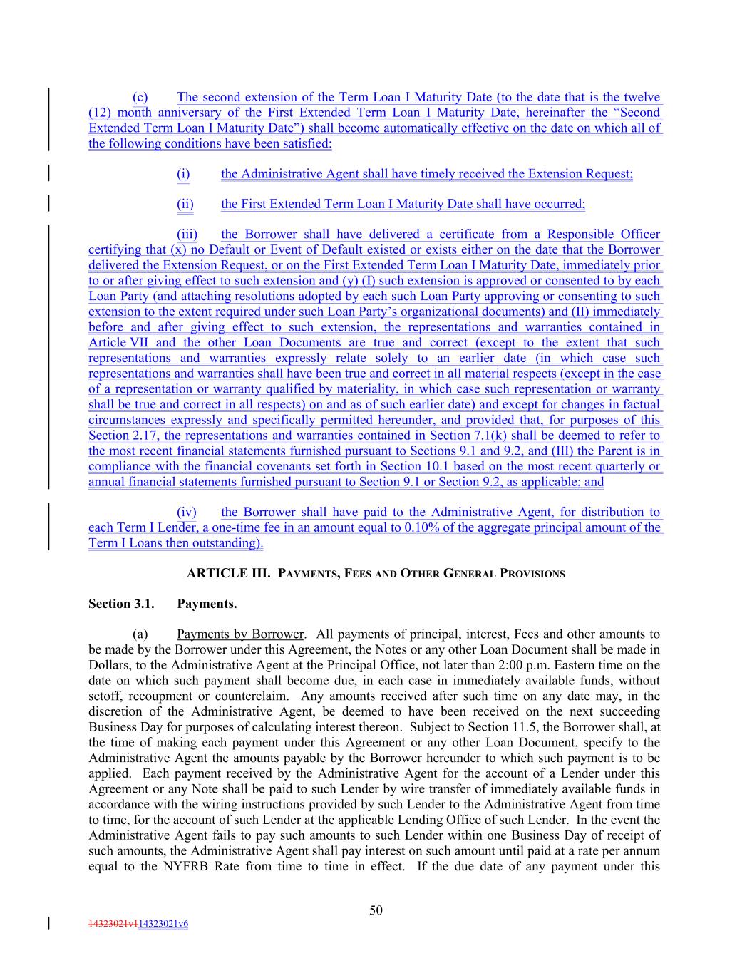 (c) The second extension of the Term Loan I Maturity Date (to the date that is the twelve (12) month anniversary of the First Extended Term Loan I Maturity Date, hereinafter the “Second Extended Term Loan I Maturity Date”) shall become automatically effective on the date on which all of the following conditions have been satisfied: (i) the Administrative Agent shall have timely received the Extension Request; (ii) the First Extended Term Loan I Maturity Date shall have occurred; (iii) the Borrower shall have delivered a certificate from a Responsible Officer certifying that (x) no Default or Event of Default existed or exists either on the date that the Borrower delivered the Extension Request, or on the First Extended Term Loan I Maturity Date, immediately prior to or after giving effect to such extension and (y) (I) such extension is approved or consented to by each Loan Party (and attaching resolutions adopted by each such Loan Party approving or consenting to such extension to the extent required under such Loan Party’s organizational documents) and (II) immediately before and after giving effect to such extension, the representations and warranties contained in Article VII and the other Loan Documents are true and correct (except to the extent that such representations and warranties expressly relate solely to an earlier date (in which case such representations and warranties shall have been true and correct in all material respects (except in the case of a representation or warranty qualified by materiality, in which case such representation or warranty shall be true and correct in all respects) on and as of such earlier date) and except for changes in factual circumstances expressly and specifically permitted hereunder, and provided that, for purposes of this Section 2.17, the representations and warranties contained in Section 7.1(k) shall be deemed to refer to the most recent financial statements furnished pursuant to Sections 9.1 and 9.2, and (III) the Parent is in compliance with the financial covenants set forth in Section 10.1 based on the most recent quarterly or annual financial statements furnished pursuant to Section 9.1 or Section 9.2, as applicable; and (iv) the Borrower shall have paid to the Administrative Agent, for distribution to each Term I Lender, a one-time fee in an amount equal to 0.10% of the aggregate principal amount of the Term I Loans then outstanding). ARTICLE III. PAYMENTS, FEES AND OTHER GENERAL PROVISIONS Section 3.1. Payments. (a) Payments by Borrower. All payments of principal, interest, Fees and other amounts to be made by the Borrower under this Agreement, the Notes or any other Loan Document shall be made in Dollars, to the Administrative Agent at the Principal Office, not later than 2:00 p.m. Eastern time on the date on which such payment shall become due, in each case in immediately available funds, without setoff, recoupment or counterclaim. Any amounts received after such time on any date may, in the discretion of the Administrative Agent, be deemed to have been received on the next succeeding Business Day for purposes of calculating interest thereon. Subject to Section 11.5, the Borrower shall, at the time of making each payment under this Agreement or any other Loan Document, specify to the Administrative Agent the amounts payable by the Borrower hereunder to which such payment is to be applied. Each payment received by the Administrative Agent for the account of a Lender under this Agreement or any Note shall be paid to such Lender by wire transfer of immediately available funds in accordance with the wiring instructions provided by such Lender to the Administrative Agent from time to time, for the account of such Lender at the applicable Lending Office of such Lender. In the event the Administrative Agent fails to pay such amounts to such Lender within one Business Day of receipt of such amounts, the Administrative Agent shall pay interest on such amount until paid at a rate per annum equal to the NYFRB Rate from time to time in effect. If the due date of any payment under this 50 14323021v114323021v6