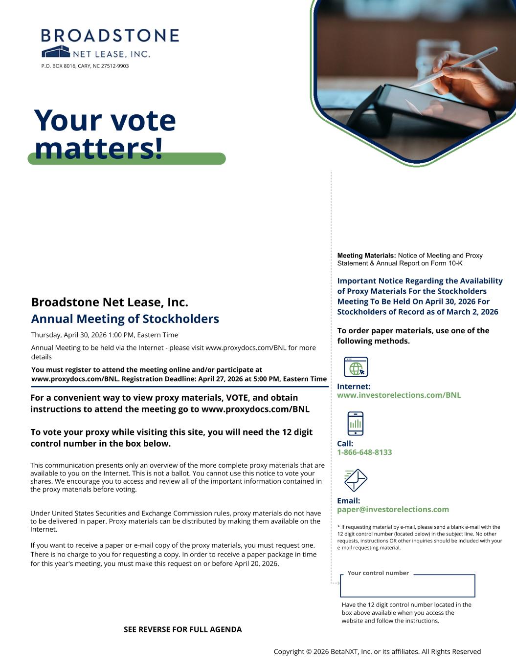 Your control number Your vote matters! Meeting Materials: Notice of Meeting and Proxy Statement & Annual Report on Form 10-K Important Notice Regarding the Availability of Proxy Materials For the Stockholders Meeting To Be Held On April 30, 2026 For Stockholders of Record as of March 2, 2026 To order paper materials, use one of the following methods. Internet: www.investorelections.com/BNL Call: 1-866-648-8133 Email: paper@investorelections.com * If requesting material by e-mail, please send a blank e-mail with the 12 digit control number (located below) in the subject line. No other requests, instructions OR other inquiries should be included with your e-mail requesting material. Have the 12 digit control number located in the box above available when you access the website and follow the instructions. Copyright © 2026 BetaNXT, Inc. or its affiliates. All Rights Reserved Broadstone Net Lease, Inc. Annual Meeting of Stockholders Thursday, April 30, 2026 1:00 PM, Eastern Time Annual Meeting to be held via the Internet - please visit www.proxydocs.com/BNL for more details You must register to attend the meeting online and/or participate at www.proxydocs.com/BNL. Registration Deadline: April 27, 2026 at 5:00 PM, Eastern Time For a convenient way to view proxy materials, VOTE, and obtain instructions to attend the meeting go to www.proxydocs.com/BNL To vote your proxy while visiting this site, you will need the 12 digit control number in the box below. This communication presents only an overview of the more complete proxy materials that are available to you on the Internet. This is not a ballot. You cannot use this notice to vote your shares. We encourage you to access and review all of the important information contained in the proxy materials before voting. Under United States Securities and Exchange Commission rules, proxy materials do not have to be delivered in paper. Proxy materials can be distributed by making them available on the Internet. If you want to receive a paper or e-mail copy of the proxy materials, you must request one. There is no charge to you for requesting a copy. In order to receive a paper package in time for this year's meeting, you must make this request on or before April 20, 2026. styleINA P.O. BOX 8016, CARY, NC 27512-9903 SEE REVERSE FOR FULL AGENDA