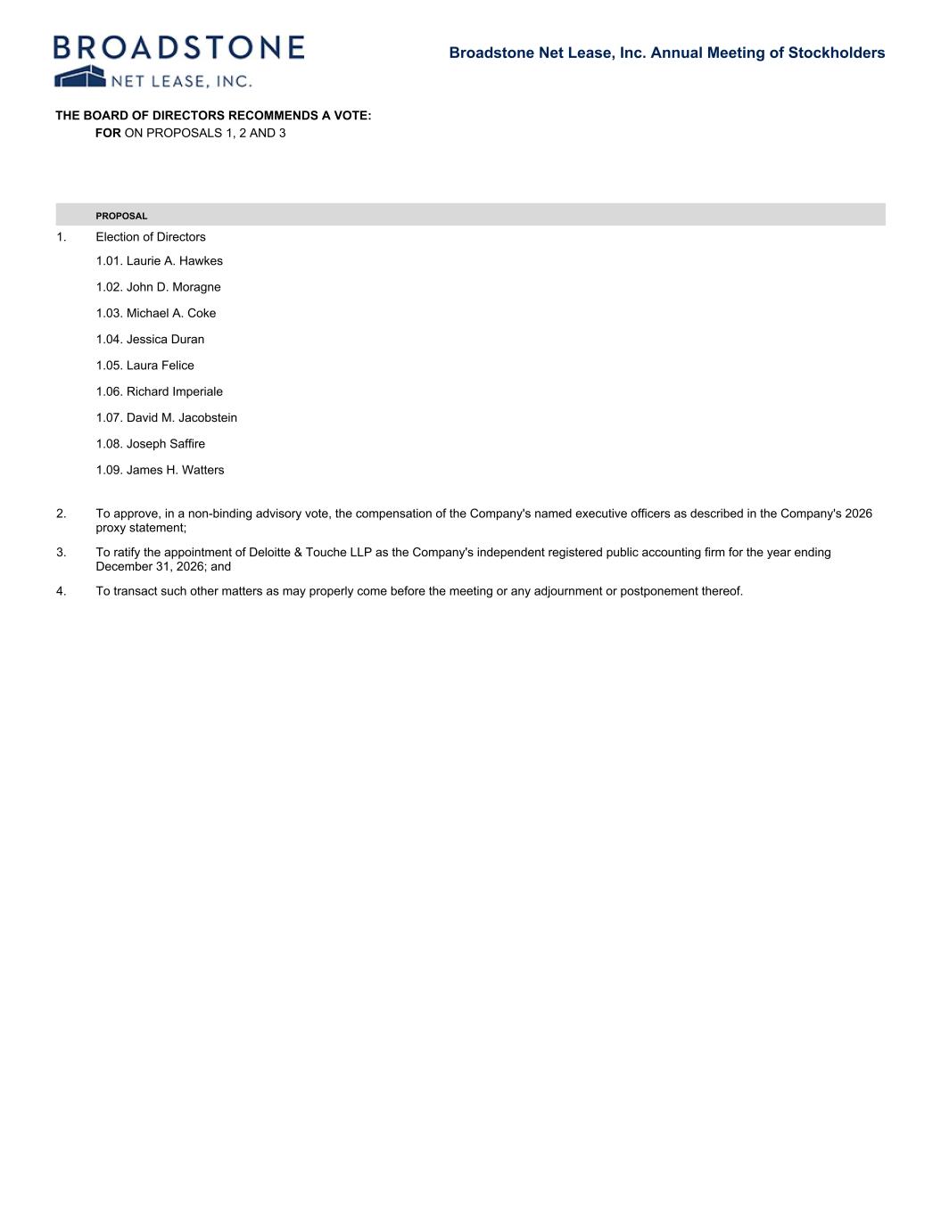 PROPOSAL 1. Election of Directors 1.01. Laurie A. Hawkes 1.02. John D. Moragne 1.03. Michael A. Coke 1.04. Jessica Duran 1.05. Laura Felice 1.06. Richard Imperiale 1.07. David M. Jacobstein 1.08. Joseph Saffire 1.09. James H. Watters 2. To approve, in a non-binding advisory vote, the compensation of the Company's named executive officers as described in the Company's 2026 proxy statement; 3. To ratify the appointment of Deloitte & Touche LLP as the Company's independent registered public accounting firm for the year ending December 31, 2026; and 4. To transact such other matters as may properly come before the meeting or any adjournment or postponement thereof. THE BOARD OF DIRECTORS RECOMMENDS A VOTE: FOR ON PROPOSALS 1, 2 AND 3 Broadstone Net Lease, Inc. Annual Meeting of Stockholders