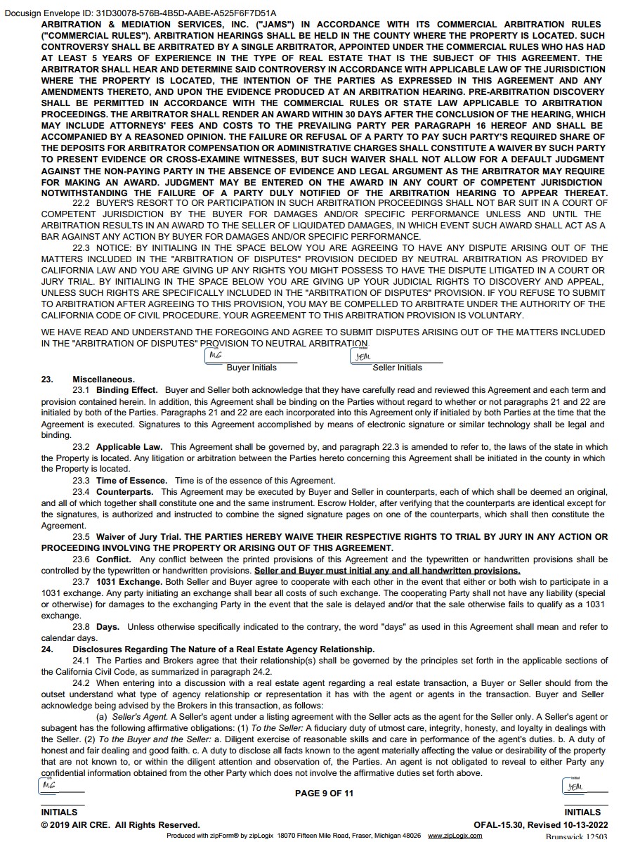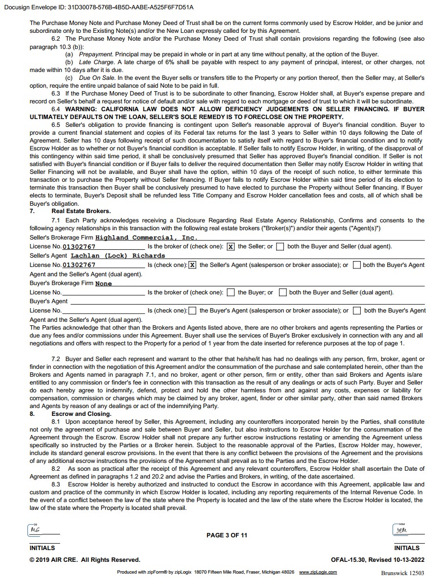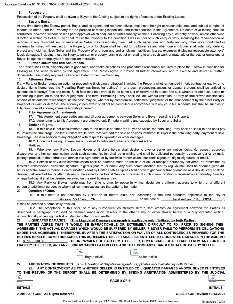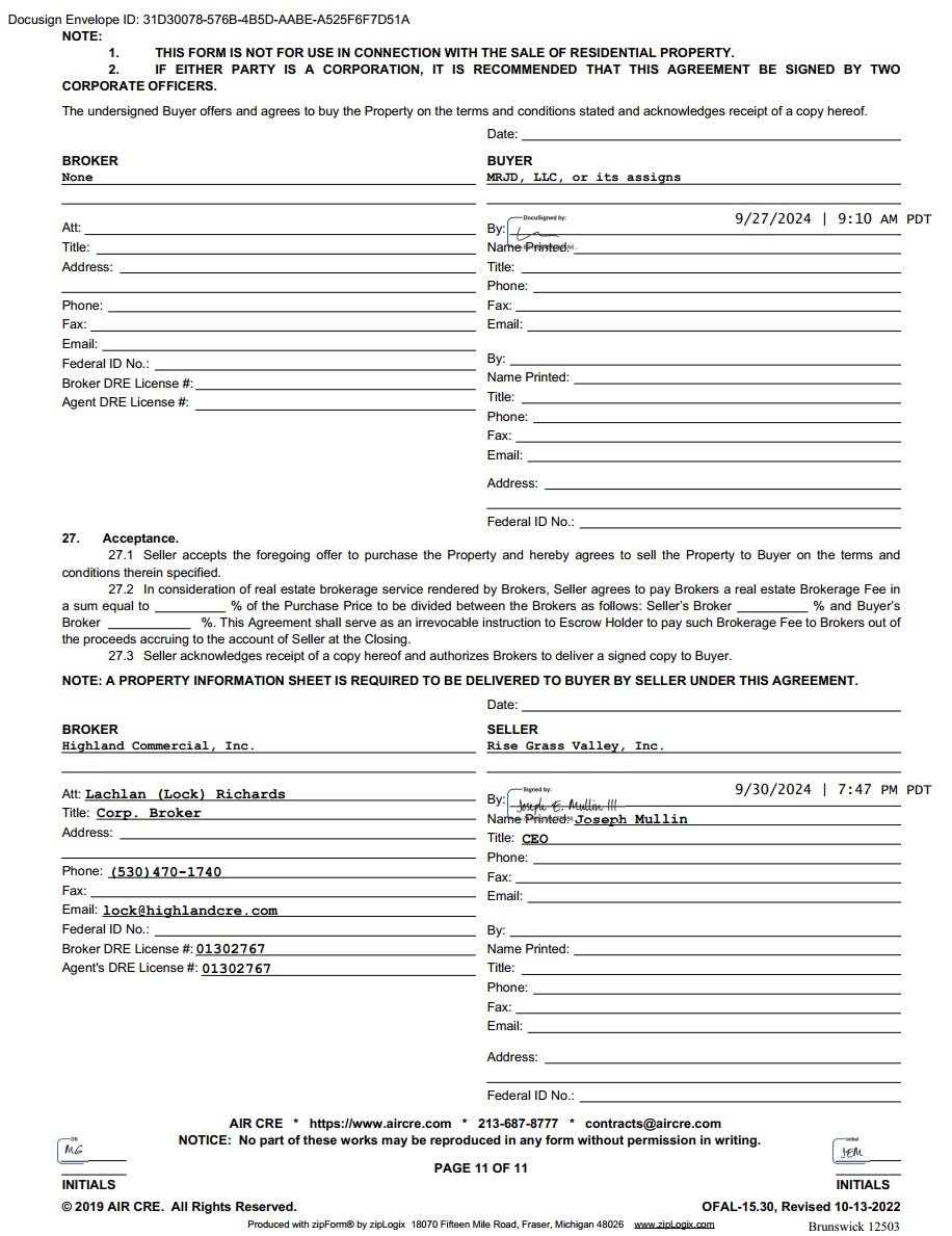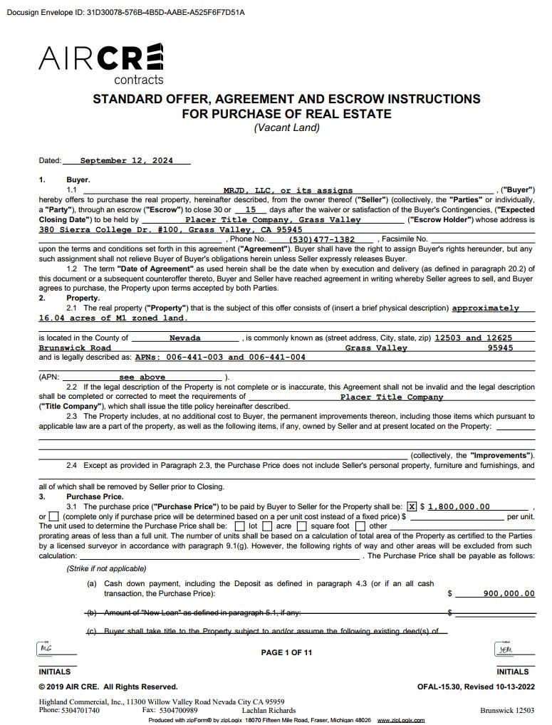 The following terms and conditions are hereby incorporated in and made a part of the "Standard Offer, Agreement and Escrow Instructions for Purchase of Real Estate (Vacant Land)" ("Agreement") dated September 12, 2024, on property known as 12503 and 12625 Brunswick Rd, Grass Valley, CA 95945 in which MRJD, LLC, or its assigns is referred to as Buyer and Rise Grass Valley, Inc. is referred to as Seller. Where the terms of this Addendum and the terms of the Agreement conflict, the terms of this Addendum shall in all instances prevail. Any defined term not otherwise defined herein shall have the meaning ascribed to such term in the Agreement.