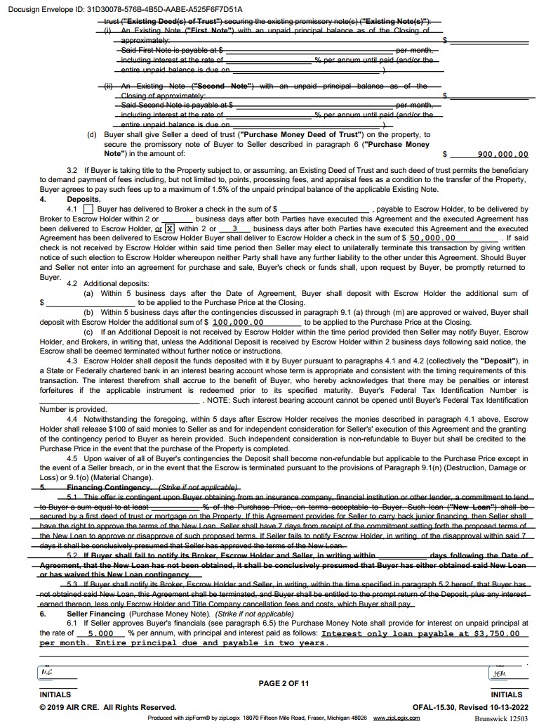 2. Additional Deposit: The additional deposit referenced in Section 4.2(b) of the Agreement, when made, shall be non-refundable to Buyer, but applicable to the Purchase Price.