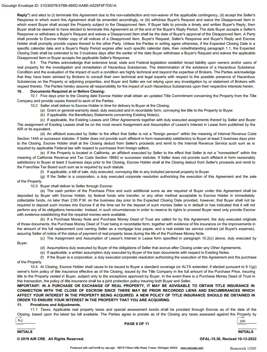1. Contingent Agreement: This Agreement shall not become valid or effective unless and until the parties sign a separate purchase agreement for the 50.01 acre property known as 12791 Brunswick Road.