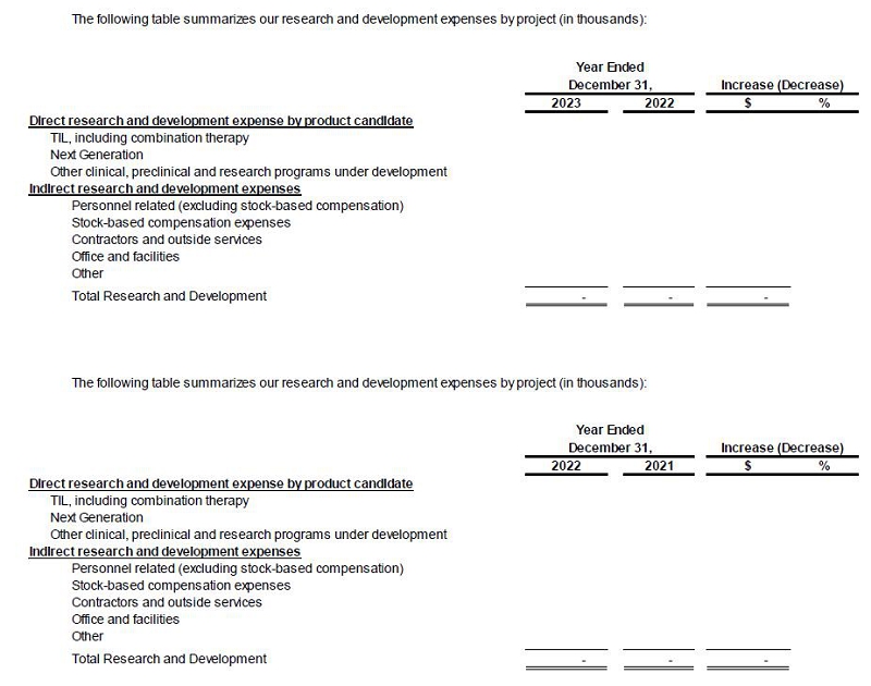 “We separate our research and development expenses into two broad categories: direct and indirect. Additionally, with respect to direct research and development expenses, we further divide expenses into the following sub-categories: ‘TIL, including combination therapy,’ ‘Next Generation,’ and ‘Other clinical, preclinical and research programs under development.’ For direct research and development expenses, we track specific project research and development expenses that are directly attributable to our preclinical and clinical development candidates that have been selected for further development. Such direct research and development expenses include third-party contract costs relating to the manufacturing of TILs as well as preclinical and clinical trial activities.