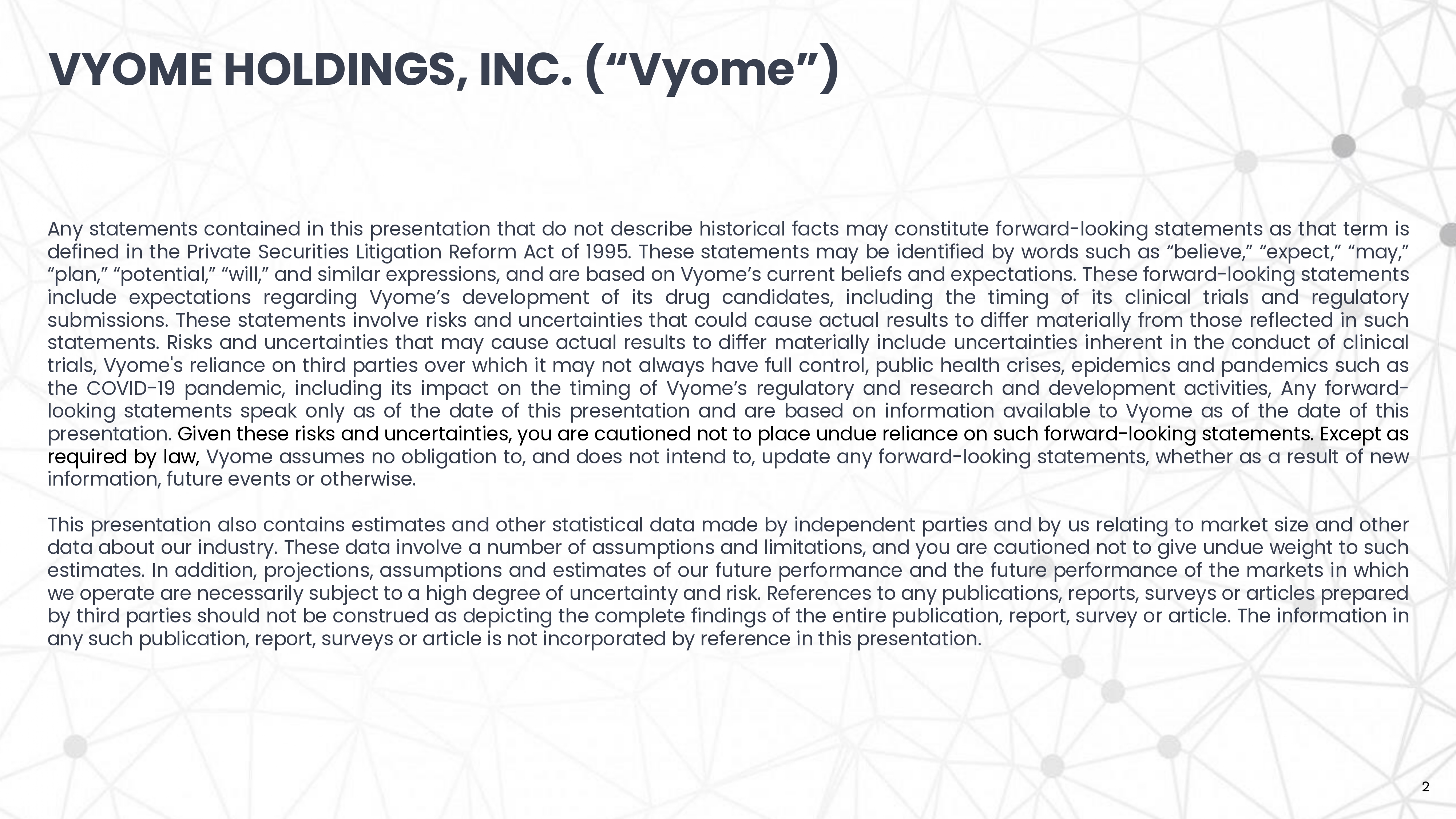 VYOME HOLDINGS, INC. (“Vyome”) 2 Any statements contained in this presentation that do not describe historical facts may constitute forward - looking statements as that term is defined in the Private Securities Litigation Reform Act of 1995 . These statements may be identified by words such as “believe,” “expect,” “may,” “plan,” “potential,” “will,” and similar expressions, and are based on Vyome’s current beliefs and expectations . These forward - looking statements include expectations regarding Vyome’s development of its drug candidates, including the timing of its clinical trials and regulatory ese statements involve risks and uncertainties that could c submissions. Th ause actual results to differ materially from those reflected in such statements. Risks and uncertainties that may cause actual results to differ materially include uncertainties inherent in the conduct of clinical eliance on third parties over which it may not always have trials, Vyome's r full control, public health crises, epidemics and pandemics such as the COVID - 19 pandemic, including its impact on the timing of Vyome’s regulatory and research and development activities, Any forward - looking statements speak only as of the date of this presentation and are based on information available to Vyome as of the date of this presentation . Given these risks and uncertainties, you are cautioned not to place undue reliance on such forward - looking statements . Except as required by law, Vyome assumes no obligation to, and does not intend to, update any forward - looking statements, whether as a result of new information, future events or otherwise . This presentation also contains estimates and other statistical data made by independent parties and by us relating to market size and other data about our industry . These data involve a number of assumptions and limitations, and you are cautioned not to give undue weight to such estimates . In addition, projections, assumptions and estimates of our future performance and the future performance of the markets in which we operate are necessarily subject to a high degree of uncertainty and risk . References to any publications, reports, surveys or articles prepared by third parties should not be construed as depicting the complete findings of the entire publication, report, survey or article . The information in any such publication, report, surveys or article is not incorporated by reference in this presentation .