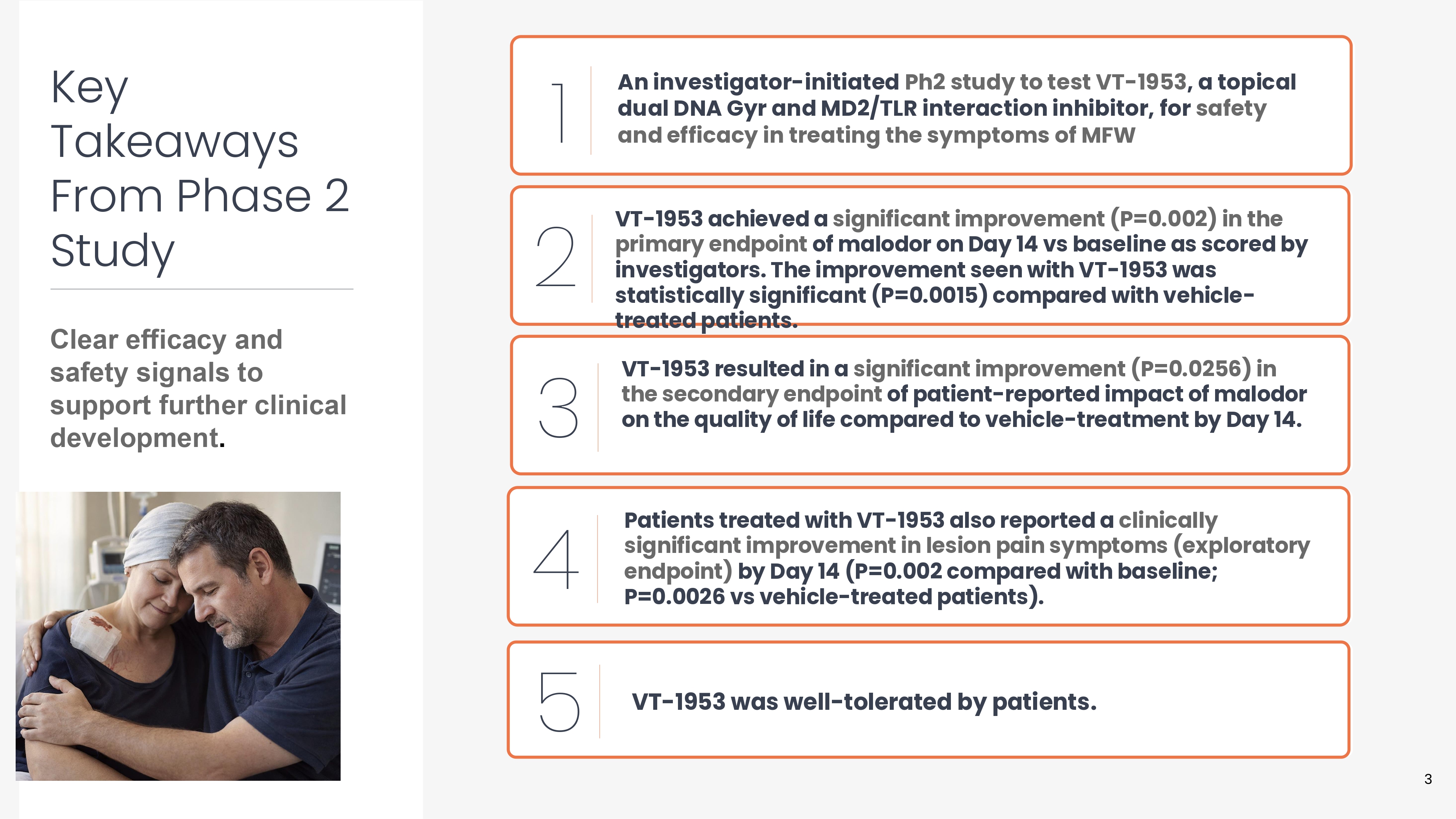 Key Takeaways From Phase 2 Study Clear efficacy and safety signals to support further clinical development . VT - 1953 achieved a significant improvement (P=0.002) in the primary endpoint of malodor on Day 14 vs baseline as scored by investigators. The improvement seen with VT - 1953 was statistically significant (P=0.0015) compared with vehicle - treated patients. VT - 1953 resulted in a significant improvement (P=0.0256) in the secondary endpoint of patient - reported impact of malodor on the quality of life compared to vehicle - treatment by Day 14. Patients treated with VT - 1953 also reported a clinically significant improvement in lesion pain symptoms (exploratory endpoint) by Day 14 (P=0.002 compared with baseline; P=0.0026 vs vehicle - treated patients). 1 a n d u A n d a l e i nv e i f f N A a c y c D s t i G g y r i a t o n a n r e t r - d i n i a M t i t D n g i a 2 t / T t h e e d L R Ph 2 y m s n t e i s t r a p c o t u d y m s i t o t o n t o i e f n h M s t i b F i W V T t o - 1 9 , r 5 3 r o f , s a a t f e o p y t ical 2 3 4 5 VT - 1953 was well - tolerated by patients. 3