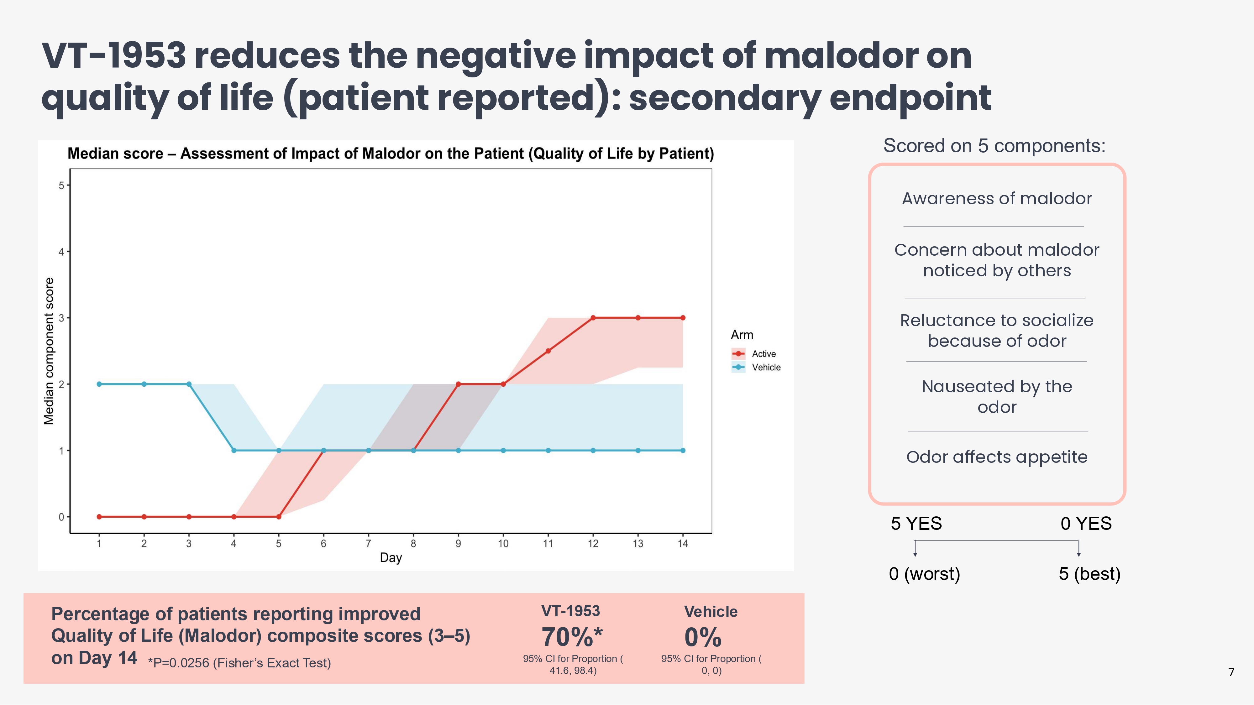 VT - 1953 treatment significantly reduced malodor (scored by investigator on Day 14): primary endpoint debt Treatment with VT - 1953 2% topical Gel resulted in a statistically significant improvement in malodor symptom by Day 14 (p = 0.0020, vs baseline. Wilcoxon Signed - Rank Test), while no significant change was observed in the Vehicle arm (p > 0.9999). VT - 1953 treatment is significantly superior to vehicle treatment (p = 0.0015, Wilcoxon Rank - Sum Test ). 80% of patients on VT - 1953 had a > 2 point improvement over 14 Days vs 0% on vehicle arm . There was a statistically significant improvement in the VT - 1953 - treated patients as early as 7 days (P=0.0156 vs baseline). By Day 14, participants treated with VT - 1953 Topical Gel showed a marked improvement, achieving a median score of 4.0 (range 3.0 - 4.0), whereas the Vehicle group remained unchanged at 1.0 (range 1.0 - 1.0). Improvement P<0.05 is considered as statistically significant. No odor Worst Malodor Mild Odor From close after removal of dressing Malodor Detected from <3ft with dressing off Malodor Detected from >3ft<6ft with dressing on Worst Malodor Detected from 6 - 10 ft away with dressing on 6 p = 0.0020