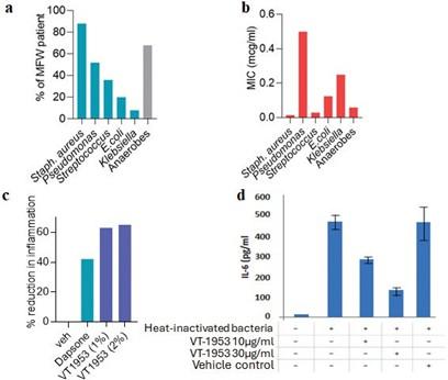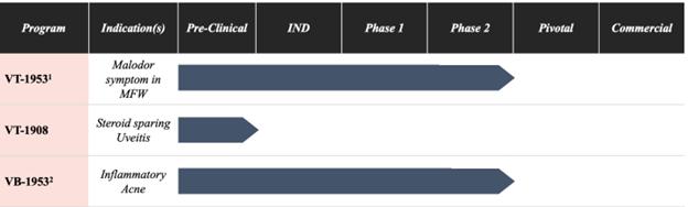 | ● | VT-1953 — Our lead program, VT-1953, is a dual DNA Gyrase/Topoisomerase inhibitor and immunomodulator in a topical gel formulation. An eye drop with the same active agent as in VT-1953 is approved by the U.S. FDA (NDA#22-308) for the treatment of bacterial conjunctivitis. We have reformulated the active agent in a topical gel for application on skin. We have tested VT-1953 topical gel for safety and efficacy in extensive preclinical studies and in four clinical trials, including phase 1 and phase 2 studies in US, with over 400 patients with moderate to severe inflammatory acne and an investigator initiated study in patients with malodorous malignant fungating wound (MFW), a debilitating immune-inflammatory condition present in approximately 5 – 14% of advanced cancer patients in the United States, according to the “The Microbiome, Malignant Fungating Wounds, and Palliative Care” article by Frontiers. Based on interim analysis, VT-1953 was found to decrease malodor in MFW by over 75% and pain by 50%. We plan to conduct pivotal studies for VT-1953 for treatment of symptoms of malignant fungating wound. We believe that VT-1953’s potential to treat symptoms of this rare and unmet medical condition can be transformative for cancer patients and their caregivers. Based on its mechanism of action, we believe VT-1953 can be expanded in the future to a broad range of potentially large indications, including inflammatory acne, diabetic foot ulcers, and pressure sores. |