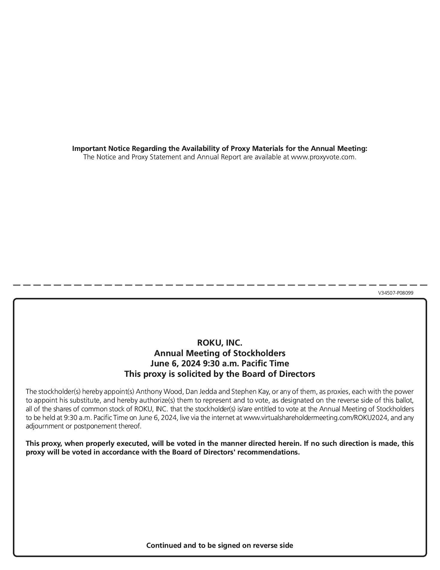 • | To vote online during the Annual Meeting, follow the provided instructions to join the meeting at www.virtualshareholdermeeting.com/ROKU2024 starting at 9:30 a.m. Pacific Time on June 6, 2024. |