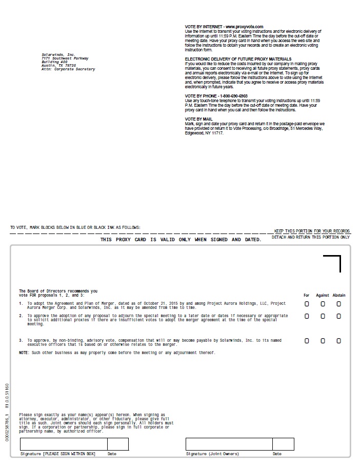 VOTE BY INTERNET - www.proxyvote.com Use the Internet to transmit your voting instructions and for electronic delivery of information up until 11:59 P.M. Eastern Time the day before the cut-off date or meeting date. Have your proxy card in hand when you access the web site and follow the instructions to obtain your records and to create an electronic voting instruction form. Solarwinds, Inc. 7171 Southwest Parkway Building 400 ELECTRONIC DELIVERY OF FUTURE PROXY MATERIALS If you would like to reduce the costs incurred by our company in mailing proxy materials, you can consent to receiving all future proxy statements, proxy cards and annual reports electronically via e-mail or the Internet. To sign up for electronic delivery, please follow the instructions above to vote using the Internet and, when prompted, indicate that you agree to receive or access proxy materials electronically in future years. Austin, TX 78735 Attn: Corporate Secretary VOTE BY PHONE - 1-800-690-6903 Use any touch-tone telephone to transmit your voting instructions up until 11:59 P.M. Eastern Time the day before the cut-off date or meeting date. Have your proxy card in hand when you call and then follow the instructions. VOTE BY MAIL Mark, sign and date your proxy card and return it in the postage-paid envelope we have provided or return it to Vote Processing, c/o Broadridge, 51 Mercedes Way, Edgewood, NY 11717. TO VOTE, MARK BLOCKS BELOW IN BLUE OR BLACK INK AS FOLLOWS: KEEP THIS PORTION FOR YOUR RECORDS DETACH AND RETURN THIS PORTION ONLY THIS PROXY CARD IS VALID ONLY WHEN SIGNED AND DATED. The Board of Directors recommends you vote FOR proposals 1, 2, and 3: For 0 0 Against 0 0 Abstain 0 0 1. To adopt the Agreement and Plan of Merger, dated as of October 21, 2015 by and among Project Aurora Holdings, LLC, Project Aurora Merger Corp. and Solarwinds, Inc. as it may be amended from time to time. To approve the adoption of any proposal to adjourn the special meeting to a later date or dates if necessary or appropriate to solicit additional proxies if there are insufficient votes to adopt the merger agreement at the time of the special meeting. 2. 0 0 0 3. To approve, by non-binding, advisory vote, compensation that will or may become payable by Solarwinds, Inc. to its named executive officers that is based on or otherwise relates to the merger. NOTE: Such other business as may properly come before the meeting or any adjournment thereof. Please sign exactly as your name(s) appear(s) hereon. When signing as attorney, executor, administrator, or other fiduciary, please give full title as such. Joint owners should each sign personally. All holders must sign. If a corporation or partnership, please sign in full corporate or partnership name, by authorized officer. Signature [PLEASE SIGN WITHIN BOX] Date Signature (Joint Owners) Date 0000258786_1 R1.0.0.51160