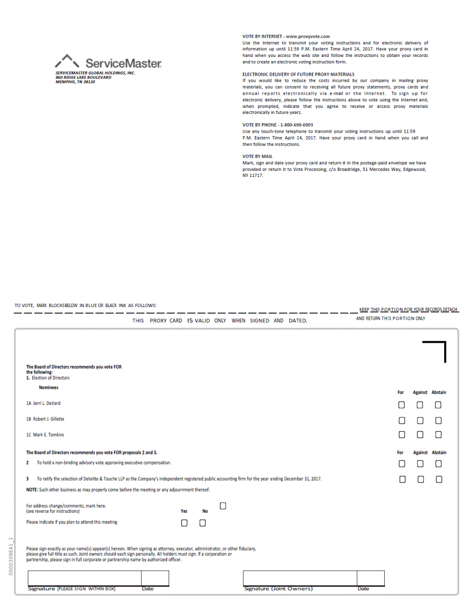 VOTE BY INTERNET - www.proxyvote.com Use the Internet to transmit your voting instructions and for electronic delivery of information up until 11:59 P.M. Eastern Time April 24, 2017. Have your proxy card in hand when you access the web site and follow the instructions to obtain your records and to create an electronic voting instruction form. SERVICEMASTER GLOBAL HOLDINGS, INC. 860 RIDGE LAKE BOULEVARD MEMPHIS, TN 38120 ELECTRONIC DELIVERY OF FUTURE PROXY MATERIALS If you would like to reduce the costs incurred by our company in mailing proxy materials, you can consent to receiving all future proxy statements, proxy cards and annua l reports el ectron ical ly via e-mail or the Intern et. To sign up fo r electronic delivery, please follow the instructions above to vote using the Internet and, when prompted, indicate that you agree to receive or access proxy materials electronically in future years. VOTE BY PHONE - 1-800-690-6903 Use any touch-tone telephone to transmit your voting instructions up until 11:59 P.M. Eastern Time April 24, 2017. Have your proxy card in hand when you call and then follow the instructions. VOTE BY MAIL Mark, sign and date your proxy card and return it in the postage-paid envelope we have provided or return it to Vote Processing, c/o Broadridge, 51 Mercedes Way, Edgewood, NY 11717. TO VOTE, MARK BLOCKSBELOW IN BLUE OR BLACK INK AS FOLLOWS: KEEP THIS PORTION FOR YOUR RECORDS DETACH AND RETURN T H I S PORTION ONLY THIS PROXY CARD IS VALID ONLY WHEN SIGNED AND DATED. The Board of Directors recommends you vote FOR the following: 1. Election of Directors Nominees For Against Abstain 1A Jerri L. DeVard 1B Robert J. Gillette 1C Mark E. Tomkins The Board of Directors recommends you vote FOR proposals 2 and 3. 2To hold a non-binding advisory vote approving executive compensation. For Against Abstain 3To ratify the selection of Deloitte & Touche LLP as the Company's independent registered public accounting firm for the year ending December 31, 2017. NOTE: Such other business as may properly come before the meeting or any adjournment thereof. For address change/comments, mark here. (see reverse for instructions) Please indicate if you plan to attend this meeting Yes No Please sign exactly as your name(s) appear(s) hereon. When signing as attorney, executor, administrator, or other fiduciary, please give full title as such. Joint owners should each sign personally. All holders must sign. If a corporation or partnership, please sign in full corporate or partnership name by authorized officer. Signature [PLEASE SIGN WITHIN BOX] Date Signature (Joint Date O w n e r s ) 0000309841_1
