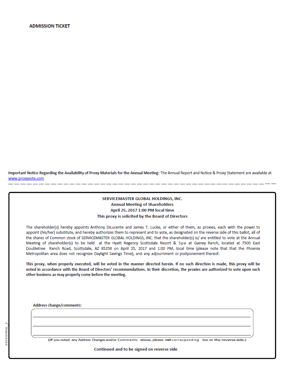 ADMISSION TICKET Important Notice Regarding the Availability of Proxy Materials for the Annual Meeting: The Annual Report and Notice & Proxy Statement are available at www.proxyvote.com SERVICEMASTER GLOBAL HOLDINGS, INC. Annual Meeting of Shareholders April 25, 2017 1:00 PM local time This proxy is solicited by the Board of Directors The shareholder(s) hereby appoints Anthony DiLucente and James T. Lucke, or either of them, as proxies, each with the power to appoint (his/her) substitute, and hereby authorizes them to represent and to vote, as designated on the reverse side of this ballot, all of the shares of Common stock of SERVICEMASTER GLOBAL HOLDINGS, INC. that the shareholder(s) is/ are entitled to vote at the Annual Meeting of shareholder(s) to be held at the Hyatt Regency Scottsdale Resort & S p a at Gainey Ranch, located at 7500 East Doubletree Ranch Road, Scottsdale, AZ 85258 on April 25, 2017 and 1:00 PM, local time (please note that that the Phoenix Metropolitan area does not recognize Daylight Savings Time), and any adjournment or postponement thereof. This proxy, when properly executed, will be voted in the manner directed herein. If no such direction is made, this proxy will be voted in accordance with the Board of Directors' recommendations. In their discretion, the proxies are authorized to vote upon such other business as may properly come before the meeting. Address change/comments: (If you noted any Address Changes and/or C o m m e n t s above, please mark c o r r e s p o n di ng box on the reverse side.) Continued and to be signed on reverse side 0000309841_2