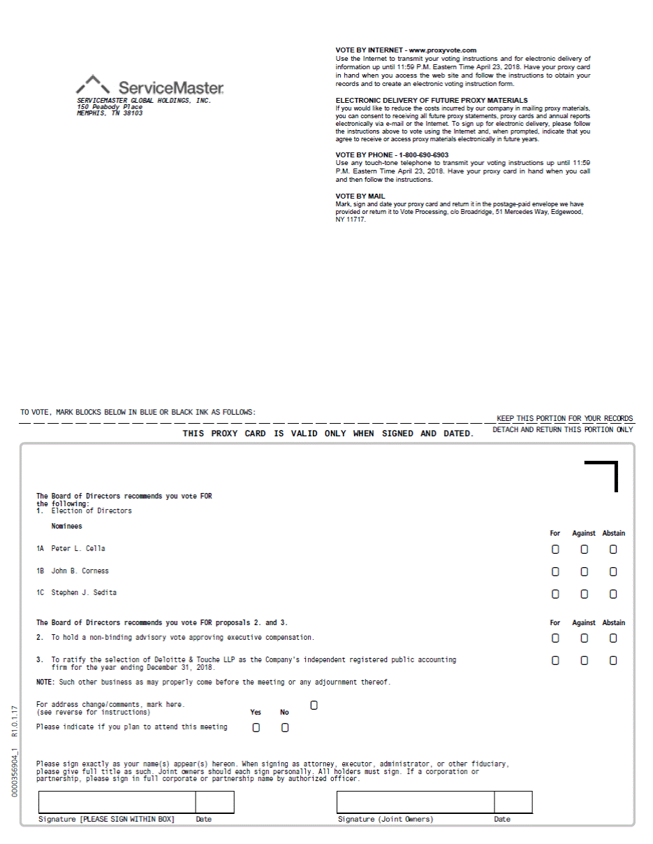 VOTE BY INTERNET - www.proxyvote.com Use the Internet to transmit your voting instructions and for electronic delivery of information up until 11:59 P.M. Eastern Time April 23, 2018. Have your proxy card in hand when you access the web site and follow the instructions to obtain your records and to create an electronic voting instruction form. SERVICEMASTER GLOBAL HOLDINGS, INC. 150 Peabody Place MEMPHIS, TN 38103 ELECTRONIC DELIVERY OF FUTURE PROXY MATERIALS If you would like to reduce the costs incurred by our company in mailing proxy materials, you can consent to receiving all future proxy statements, proxy cards and annual reports electronically via e-mail or the Internet. To sign up for electronic delivery, please follow the instructions above to vote using the Internet and, when prompted, indicate that you agree to receive or access proxy materials electronically in future years. VOTE BY PHONE - 1-800-690-6903 Use any touch-tone telephone to transmit your voting instructions up until 11:59 P.M. Eastern Time April 23, 2018. Have your proxy card in hand when you call and then follow the instructions. VOTE BY MAIL Mark, sign and date your proxy card and return it in the postage-paid envelope we have provided or return it to Vote Processing, c/o Broadridge, 51 Mercedes Way, Edgewood, NY 11717. TO VOTE, MARK BLOCKS BELOW IN BLUE OR BLACK INK AS FOLLOWS: KEEP THIS PORTION FOR YOUR RECORDS DETACH AND RETURN THIS PORTION ONLY THIS PROXY CARD IS VALID ONLY WHEN SIGNED AND DATED. The Board of Directors recommends you vote FOR the following: 1. Election of Directors Nominees For 0 0 0 For 0 0 Against 0 0 0 Against 0 0 Abstain 0 0 0 Abstain 0 0 1A Peter L. Cella 1B John B. Corness 1C Stephen J. Sedita The Board of Directors recommends you vote FOR proposals 2. and 3. 2. To hold a non-binding advisory vote approving executive compensation. 3. To ratify the selection of Deloitte & Touche LLP as the Company's independent registered public accounting firm for the year ending December 31, 2018. NOTE: Such other business as may properly come before the meeting or any adjournment thereof. 0 For address change/comments, mark here. (see reverse for instructions) Please indicate if you plan to attend this meeting Yes 0 No 0 Please sign exactly as your name(s) appear(s) hereon. When signing as attorney, executor, administrator, or other fiduciary, please give full title as such. Joint owners should each sign personally. All holders must sign. If a corporation or partnership, please sign in full corporate or partnership name by authorized officer. Signature [PLEASE SIGN WITHIN BOX] Date Signature (Joint Owners) Date 0000356904_1 R1.0.1.17