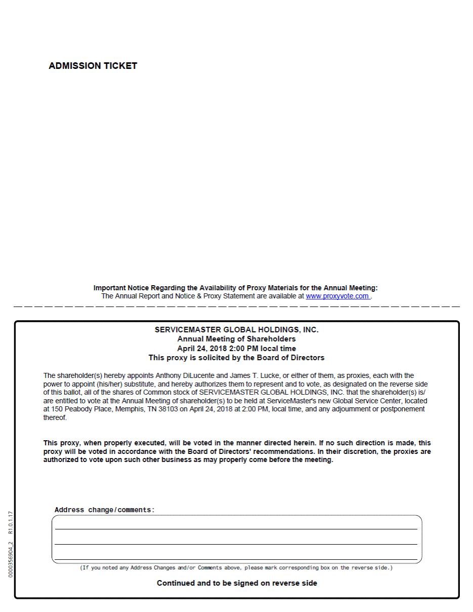 ADMISSION TICKET Important Notice Regarding the Availability of Proxy Materials for the Annual Meeting: The Annual Report and Notice & Proxy Statement are available at www.proxyvote.com . SERVICEMASTER GLOBAL HOLDINGS, INC. Annual Meeting of Shareholders April 24, 2018 2:00 PM local time This proxy is solicited by the Board of Directors The shareholder(s) hereby appoints Anthony DiLucente and James T. Lucke, or either of them, as proxies, each with the power to appoint (his/her) substitute, and hereby authorizes them to represent and to vote, as designated on the reverse side of this ballot, all of the shares of Common stock of SERVICEMASTER GLOBAL HOLDINGS, INC. that the shareholder(s) is/ are entitled to vote at the Annual Meeting of shareholder(s) to be held at ServiceMaster's new Global Service Center, located at 150 Peabody Place, Memphis, TN 38103 on April 24, 2018 at 2:00 PM, local time, and any adjournment or postponement thereof. This proxy, when properly executed, will be voted in the manner directed herein. If no such direction is made, this proxy will be voted in accordance with the Board of Directors' recommendations. In their discretion, the proxies are authorized to vote upon such other business as may properly come before the meeting. Address change/comments: (If you noted any Address Changes and/or Comments above, please mark corresponding box on the reverse side.) Continued and to be signed on reverse side 0000356904_2 R1.0.1.17