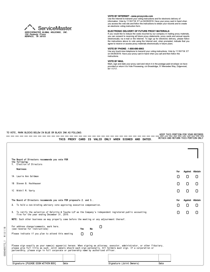 VOTE BY INTERNET - www.proxyvote.com Use the Internet to transmit your voting instructions and for electronic delivery of information. Vote by 11:59 P.M. ET on 04/29/2019. Have your proxy card in hand when you access the web site and follow the instructions to obtain your records and to create an electronic voting instruction form. ELECTRONIC DELIVERY OF FUTURE PROXY MATERIALS If you would like to reduce the costs incurred by our company in mailing proxy materials, you can consent to receiving all future proxy statements, proxy cards and annual reports electronically via e-mail or the Internet. To sign up for electronic delivery, please follow the instructions above to vote using the Internet and, when prompted, indicate that you agree to receive or access proxy materials electronically in future years. SERVICEMASTER GLOBAL HOLDINGS, INC. 150 Peabody Place MEMPHIS, TN 38103 VOTE BY PHONE - 1-800-690-6903 Use any touch-tone telephone to transmit your voting instructions. Vote by 11:59 P.M. ET on 04/29/2019. Have your proxy card in hand when you call and then follow the instructions. VOTE BY MAIL Mark, sign and date your proxy card and return it in the postage-paid envelope we have provided or return it to Vote Processing, c/o Broadridge, 51 Mercedes Way, Edgewood, NY 11717. TO VOTE, MARK BLOCKS BELOW IN BLUE OR BLACK INK AS FOLLOWS: KEEP THIS PORTION FOR YOUR RECORDS DETACH AND RETURN THIS PORTION ONLY THIS PROXY CARD IS VALID ONLY WHEN SIGNED AND DATED. The Board of Directors recommends you vote FOR the following: 1. Election of Directors Nominees For 0 0 0 For 0 0 Against 0 0 0 Against 0 0 Abstain 0 0 0 Abstain 0 0 1A Laurie Ann Goldman 1B Steven B. Hochhauser 1C Nikhil M. Varty The Board of Directors recommends you vote FOR proposals 2. and 3.. 2. To hold a non-binding advisory vote approving executive compensation. 3. To ratify the selection of Deloitte & Touche LLP as the Company's independent registered public accounting firm for the year ending December 31, 2019. NOTE: Such other business as may properly come before the meeting or any adjournment thereof. 0 For address change/comments, mark here. (see reverse for instructions) Please indicate if you plan to attend this meeting Yes 0 No 0 Please sign exactly as your name(s) appear(s) hereon. When signing as attorney, executor, administrator, or other fiduciary, please give full title as such. Joint owners should each sign personally. All holders must sign. If a corporation or partnership, please sign in full corporate or partnership name by authorized officer. Signature [PLEASE SIGN WITHIN BOX] Date Signature (Joint Owners) Date 0000405772_1 R1.0.1.18