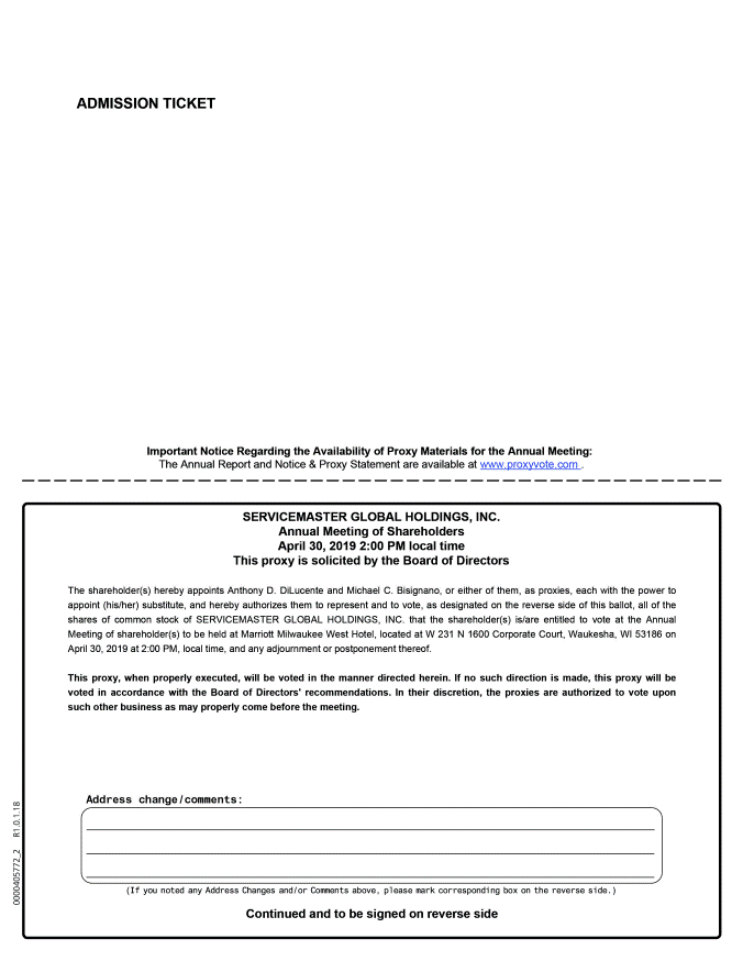ADMISSION TICKET Important Notice Regarding the Availability of Proxy Materials for the Annual Meeting: The Annual Report and Notice & Proxy Statement are available at www.proxyvote.com . SERVICEMASTER GLOBAL HOLDINGS, INC. Annual Meeting of Shareholders April 30, 2019 2:00 PM local time This proxy is solicited by the Board of Directors The shareholder(s) hereby appoints Anthony D. DiLucente and Michael C. Bisignano, or either of them, as proxies, each with the power to appoint (his/her) substitute, and hereby authorizes them to represent and to vote, as designated on the reverse side of this ballot, all of the shares of common stock of SERVICEMASTER GLOBAL HOLDINGS, INC. that the shareholder(s) is/are entitled to vote at the Annual Meeting of shareholder(s) to be held at Marriott Milwaukee West Hotel, located at W 231 N 1600 Corporate Court, Waukesha, WI 53186 on April 30, 2019 at 2:00 PM, local time, and any adjournment or postponement thereof. This proxy, when properly executed, will be voted in the manner directed herein. If no such direction is made, this proxy will be voted in accordance with the Board of Directors' recommendations. In their discretion, the proxies are authorized to vote upon such other business as may properly come before the meeting. Address change/comments: (If you noted any Address Changes and/or Comments above, please mark corresponding box on the reverse side.) Continued and to be signed on reverse side 0000405772_2 R1.0.1.18