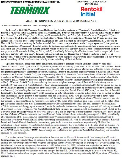 In connection with the transaction (the “Transaction”), Rentokil Initial plc (“Rentokil Initial”) has filed with the U.S. Securities and Exchange Commission (the “SEC”) a registration statement on Form F-4 (the “Registration Statement”), which includes a proxy statement of Terminix Global Holdings, Inc. (“Terminix”) that also constitutes a prospectus of Rentokil Initial (the “proxy statement/prospectus”). The SEC declared the Registration Statement effective on September 7, 2022. On September 7, 2022, Terminix filed a definitive proxy statement (the “Definitive Proxy Statement”) with the SEC in connection with the Transaction. Each of Rentokil Initial and Terminix have filed and may file other relevant documents in connection with the Transaction. The Definitive Proxy Statement was first sent to the shareholders of Terminix on September 8, 2022. Rentokil Initial has also filed a shareholder proxy circular (the “Shareholder Proxy Circular”) in connection with the Transaction with applicable securities regulators in the United Kingdom and the Shareholder Proxy Circular was first sent to Rentokil Initial’s shareholders on or about September 8, 2022. This communication is not a substitute for any registration statement, proxy statement/prospectus or other documents Rentokil Initial and/or Terminix filed or may file with the SEC in connection with the Transaction. BEFORE MAKING ANY VOTING OR INVESTMENT DECISIONS, INVESTORS, STOCKHOLDERS AND SHAREHOLDERS OF TERMINIX AND RENTOKIL INITIAL ARE URGED TO READ CAREFULLY AND IN THEIR ENTIRETY THE DEFINITIVE PROXY STATEMENT AND SHAREHOLDER PROXY CIRCULAR, AS APPLICABLE, AND ANY OTHER RELEVANT DOCUMENTS THAT ARE FILED OR WILL BE FILED WITH THE SEC OR APPLICABLE SECURITIES REGULATORS IN THE UNITED KINGDOM, AS WELL AS ANY AMENDMENTS OR SUPPLEMENTS TO THESE DOCUMENTS IN CONNECTION WITH THE TRANSACTION WHEN THEY BECOME AVAILABLE, AS THEY CONTAIN OR WILL CONTAIN IMPORTANT INFORMATION ABOUT TERMINIX, RENTOKIL INITIAL, THE TRANSACTION AND RELATED MATTERS. The Registration Statement and Definitive Proxy Statement are, and the other documents filed by Rentokil Initial and Terminix with the SEC, when filed, will be, available free of charge at the SEC’s website at www.sec.gov. In addition, investors and shareholders are able to obtain free copies of the Definitive Proxy Statement and other documents filed with the SEC by Terminix online at investors.terminix.com, upon written request delivered to Terminix at 150 Peabody Pl., Memphis, TN 38103, USA, Attention: Corporate Secretary, or by calling Terminix’s Corporate Secretary’s Office by telephone at +1 901-597-1400 or by email at deidre.richardson@terminix.com, and are able to obtain free copies of the Registration Statement, Definitive Proxy Statement, Shareholder Proxy Circular and other documents filed with the SEC and applicable securities regulators in the United Kingdom by Rentokil Initial online at https://www.rentokil-initial.com, upon written request delivered to Rentokil Initial at Compass House, Manor Royal, Crawley, West Sussex, RH10 9PY, England, Attention: Peter Russell, or by calling Rentokil Initial by telephone at +44 (0) 7811 270734 or by email at investor@rentokil-initial.com. The information included on, or accessible through, Rentokil Initial’s or Terminix’s website is not incorporated by reference into this communication. This communication is for informational purposes only and is not intended to, and shall not, constitute an offer to sell or buy or the solicitation of an offer to sell or buy any securities, nor shall there be any sale of securities in any jurisdiction in which such offer, solicitation or sale would be unlawful prior to appropriate registration or qualification under the securities laws of any such jurisdiction. No offering of securities shall be made except by means of a prospectus meeting the requirements of Section 10 of the U.S. Securities Act of 1933, as amended.