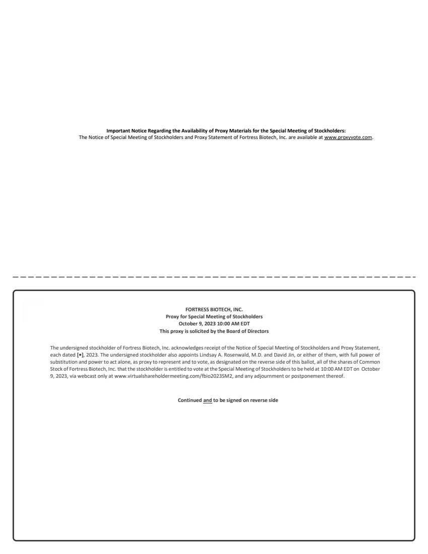 ![]() | Important Notice Regarding the Availability of Proxy Materials for the Special Meeting of Stockholders: The Notice of Special Meeting of Stockholders and Proxy Statement of Fortress Biotech, Inc. are available at www.proxyvote.com. FORTRESS BIOTECH, INC. Proxy for Special Meeting of Stockholders October 9, 2023 10:00 AM EDT This proxy is solicited by the Board of Directors The undersigned stockholder of Fortress Biotech, Inc. acknowledges receipt of the Notice of Special Meeting of Stockholders and Proxy Statement, each dated [•], 2023. The undersigned stockholder also appoints Lindsay A. Rosenwald, M.D. and David Jin, or either of them, with full power of substitution and power to act alone, as proxy to represent and to vote, as designated on the reverse side of this ballot, all of the shares of Common Stock of Fortress Biotech, Inc. that the stockholder is entitled to vote at the Special Meeting of Stockholders to be held at 10:00 AM EDT on October 9, 2023, via webcast only at www.virtualshareholdermeeting.com/fbio2023SM2, and any adjournment or postponement thereof. Continued and to be signed on reverse side |