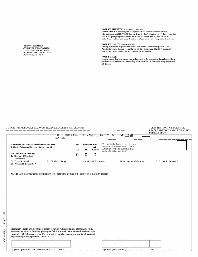 0000144038_1 R1.0.0.11699 CAREY WATERMARK INVESTORS INCORPORATED. ATTN: INVESTOR RELATIONS 50 ROCKEFELLER PLAZA FL 2 NEW YORK, NY 10020 VOTE BY INTERNET - www.proxyvote.com Use the Internet to transmit your voting instructions and for electronic delivery of information up until 11:59 P.M. Eastern Time the day before the cut-off date or meeting date. Have your proxy card in hand when you access the web site and follow the instructions to obtain your records and to create an electronic voting instruction form. VOTE BY PHONE - 1-800-690-6903 Use any touch-tone telephone to transmit your voting instructions up until 11:59 P.M. Eastern Time the day before the cut-off date or meeting date. Have your proxy card in hand when you call and then follow the instructions. VOTE BY MAIL Mark, sign and date your proxy card and return it in the postage-paid envelope we have provided or return it to Vote Processing, c/o Broadridge, 51 Mercedes Way, Edgewood, NY 11717. TO VOTE, MARK BLOCKS BELOW IN BLUE OR BLACK INK AS FOLLOWS: THIS PROXY CARD IS VALID ONLY WHEN SIGNED AND DATED. KEEP THIS PORTION FOR YOUR RECORDS DETACH AND RETURN THIS PORTION ONLY The Board of Directors recommends you vote FOR the following Directors to serve until For Withhold For All All All Except To withhold authority to vote for any individual nominee(s), mark “For All Except” and write the number(s) of the nominee(s) on the line below. the 2013 annual meeting: 1. Election of Directors Nominees 0 0 0 01 Trevor P. Bond 02 Charles S. Henry 03 Michael D. Johnson 04 Michael G. Medzigian 05 Robert E. Parsons, Jr. 06 William H. Reynolds, Jr NOTE: Such other matters as may properly come before the meeting at the discretion of the proxy holders. Please sign exactly as your name(s) appear(s) hereon. When signing as attorney, executor, administrator, or other fiduciary, please give full title as such. Joint owners should each sign personally. All holders must sign. If a corporation or partnership, please sign in full corporate or partnership name, by authorized officer. Signature [PLEASE SIGN WITHIN BOX] Date Signature (Joint Owners) Date |