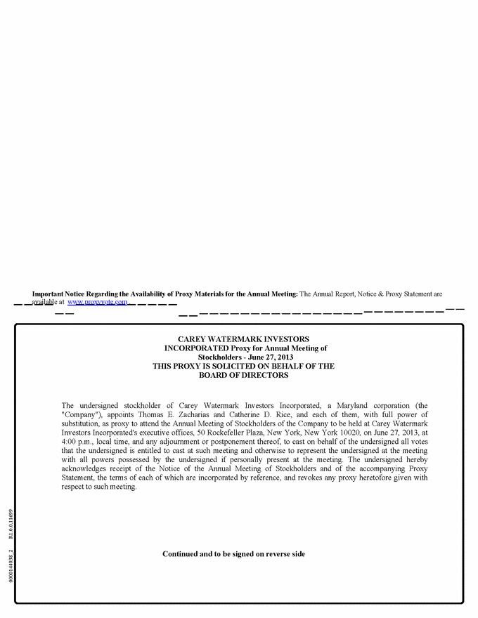 0000144038_2 R1.0.0.11699 Important Notice Regarding the Availability of Proxy Materials for the Annual Meeting: The Annual Report, Notice & Proxy Statement are available at www.proxyvote.com . CAREY WATERMARK INVESTORS INCORPORATED Proxy for Annual Meeting of Stockholders - June 27, 2013 THIS PROXY IS SOLICITED ON BEHALF OF THE BOARD OF DIRECTORS The undersigned stockholder of Carey Watermark Investors Incorporated, a Maryland corporation (the "Company"), appoints Thomas E. Zacharias and Catherine D. Rice, and each of them, with full power of substitution, as proxy to attend the Annual Meeting of Stockholders of the Company to be held at Carey Watermark Investors Incorporated's executive offices, 50 Rockefeller Plaza, New York, New York 10020, on June 27, 2013, at 4:00 p.m., local time, and any adjournment or postponement thereof, to cast on behalf of the undersigned all votes that the undersigned is entitled to cast at such meeting and otherwise to represent the undersigned at the meeting with all powers possessed by the undersigned if personally present at the meeting. The undersigned hereby acknowledges receipt of the Notice of the Annual Meeting of Stockholders and of the accompanying Proxy Statement, the terms of each of which are incorporated by reference, and revokes any proxy heretofore given with respect to such meeting. Continued and to be signed on reverse side |