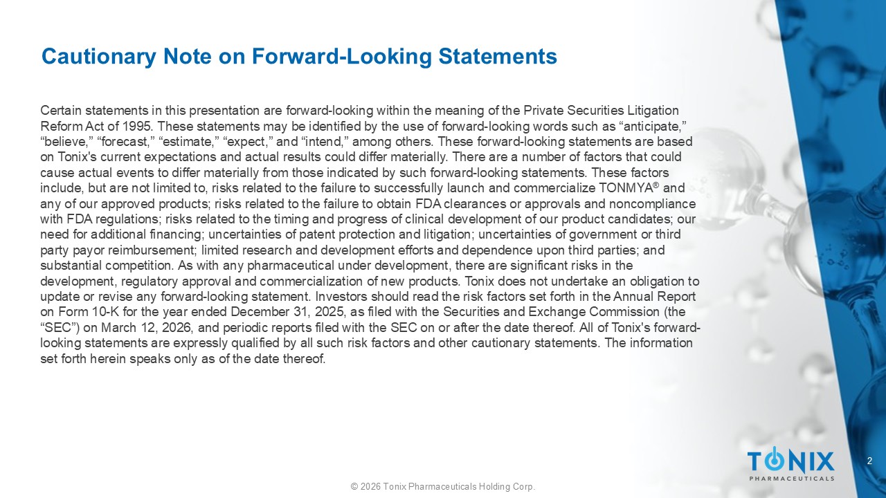 2 © 2026 Tonix Pharmaceuticals Holding Corp. Cautionary Note on Forward - Looking Statements Certain statements in this presentation are forward - looking within the meaning of the Private Securities Litigation Reform Act of 1995. These statements may be identified by the use of forward - looking words such as “anticipate,” “believe,” “forecast,” “estimate,” “expect,” and “intend,” among others. These forward - looking statements are based on Tonix's current expectations and actual results could differ materially. There are a number of factors that could cause actual events to differ materially from those indicated by such forward - looking statements. These factors include, but are not limited to, risks related to the failure to successfully launch and commercialize TONMYA ® and any of our approved products; risks related to the failure to obtain FDA clearances or approvals and noncompliance with FDA regulations; risks related to the timing and progress of clinical development of our product candidates; our need for additional financing; uncertainties of patent protection and litigation; uncertainties of government or third party payor reimbursement; limited research and development efforts and dependence upon third parties; and substantial competition. As with any pharmaceutical under development, there are significant risks in the development, regulatory approval and commercialization of new products. Tonix does not undertake an obligation to update or revise any forward - looking statement. Investors should read the risk factors set forth in the Annual Report on Form 10 - K for the year ended December 31, 2025, as filed with the Securities and Exchange Commission (the “SEC”) on March 12, 2026, and periodic reports filed with the SEC on or after the date thereof. All of Tonix's forward - looking statements are expressly qualified by all such risk factors and other cautionary statements. The information set forth herein speaks only as of the date thereof.