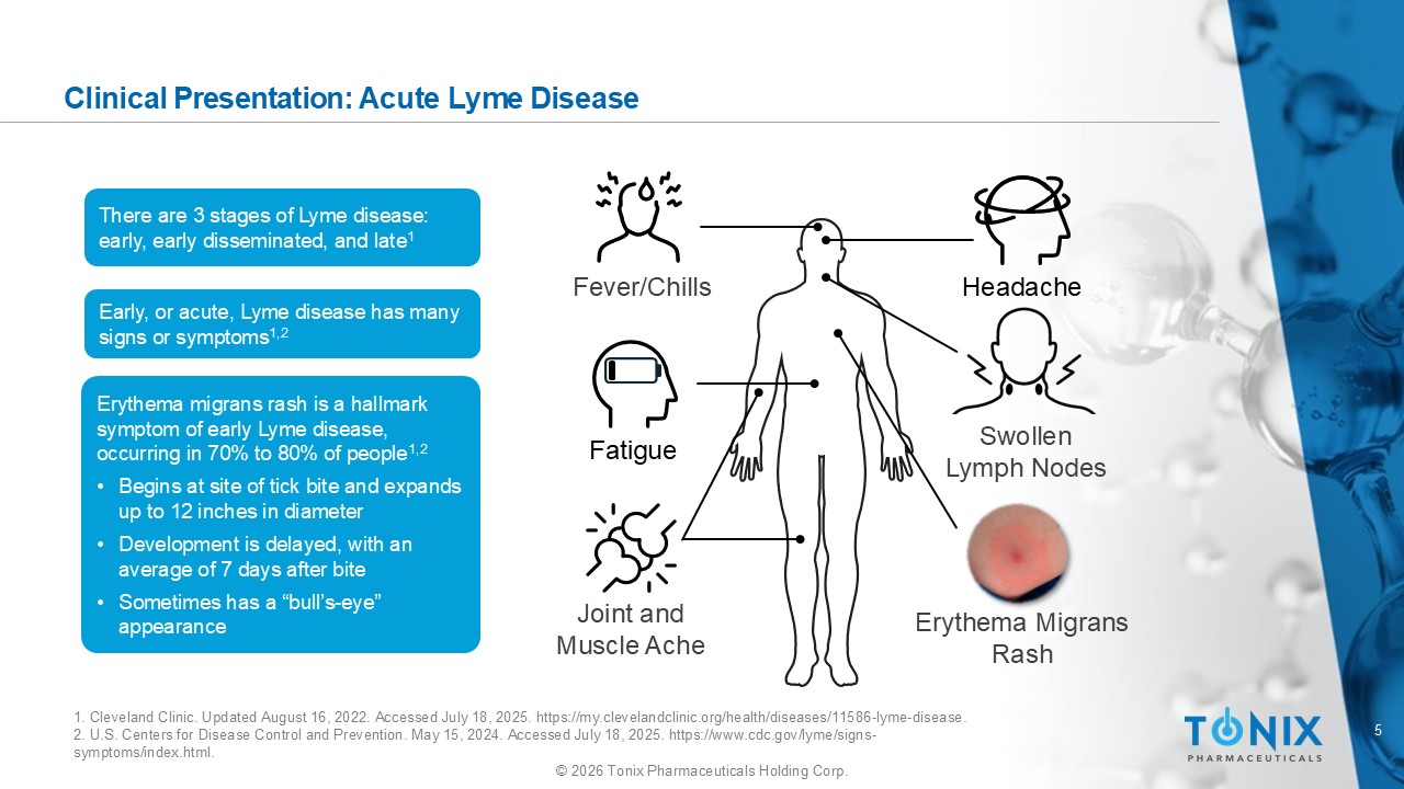 4 © 2026 Tonix Pharmaceuticals Holding Corp. 1. U.S. Centers for Disease Control and Prevention. National Notifiable Diseases Surveillance System; maps. February 11, 2025 . A ccessed July 18, 2025. https://www.cdc.gov/lyme/data - research/facts - stats/surveillance - data - 1.html. 2. U.S. Centers for Disease Control and Prevention. National Notifiable Diseases Surveillance System; graphs: annual cases. F ebr uary 11, 2025. Accessed July 18, 2025. https://www.cdc.gov/lyme/data - research/facts - stats/surveillance - data - 1.html 3. Rodino KG, et al. J Clin Microbiol . 2025:e0080723. Lyme Disease: Epidemiology in the U.S. Images from CDC NNDSS Lyme disease is reported most often in the Northeast and Midwest, with 95% of cases coming from “high - incidence” areas 1 1995 2023 The range of Lyme disease is expanding 1 0 50000 100000 1996 Criteria: erythema migrans or clinical presentation of late Lyme with laboratory confirmation 2008 Criteria: added reporting of “probable” cases and refined criteria for laboratory confirmation 2022 Criteria: removed requirement for clinical information in “high - incidence” areas Lyme disease is an increasing problem 2 The actual prevalence of Lyme disease is estimated to be 8 to 12 times higher than reported. 3 In 2022, more sensitive surveillance criteria resulted in a 67% increase in reported cases 2 CDC=Centers for Disease Control and Prevention; NNDSS=National Notifiable Diseases Surveillance System.