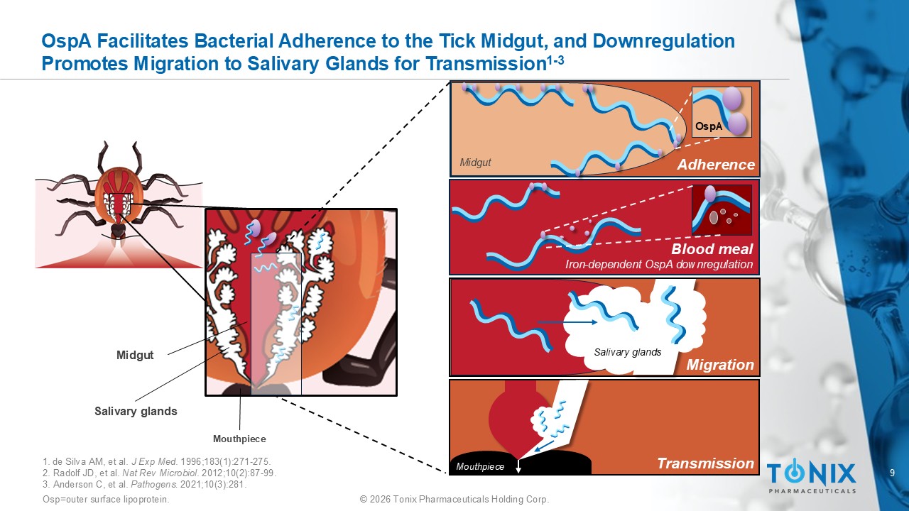 8 © 2026 Tonix Pharmaceuticals Holding Corp. B. b urgdorferi Bacteria Are Transmitted t o Humans v ia Tick Salivary Glands 1 • The outer membrane protein OspA supports B. burgdorferi survival in the tick midgut via adherence 1 - 3 • Once the tick bites a host, the iron in a blood meal downregulates Osp A, and bacteria migrate from the midgut to the salivary glands for transmission 1 - 3 • While OspA is essential for transmission, it is only expressed within infected ticks, and levels seen in the human host are insufficient for seroconversion (antibody production) 4 B. burgdorferi Outer lipid membrane OspA/ OspC Outer membrane protein Lipoprotein BamA Bam=β - barrel assembly machinery; Osp =outer surface lipoprotein. Blood meal Host Midgut Salivary glands 1. de Silva AM, et al. J Exp Med . 1996;183(1):271 - 275. 2. Radolf JD, et al. Nat Rev Microbiol . 2012;10(2):87 - 99. 3. Anderson C, et al. Pathogens. 2021;10(3):281. 4. Woodman ME, et al. FEMS Immunol Med Microbiol . 2008;54(2):277 - 282. B. burgdorferi transmission via tick saliva
