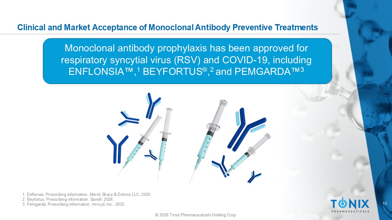 13 © 2026 Tonix Pharmaceuticals Holding Corp. Clinical and Market Acceptance o f Monoclonal Antibody Preventive Treatments Monoclonal antibody prophylaxis has been approved for respiratory syncytial virus (RSV) and COVID - 19, including ENFLONSIA , 1 BEYFORTUS ® , 2 and PEMGARDA 3 1. Enflonsia . Prescribing information. Merck Sharp & Dohme LLC; 2025. 2. Beyfortus . Prescribing information. Sanofi; 2024. 3. Pemgarda . Prescribing information. Invivyd , Inc.; 2025.
