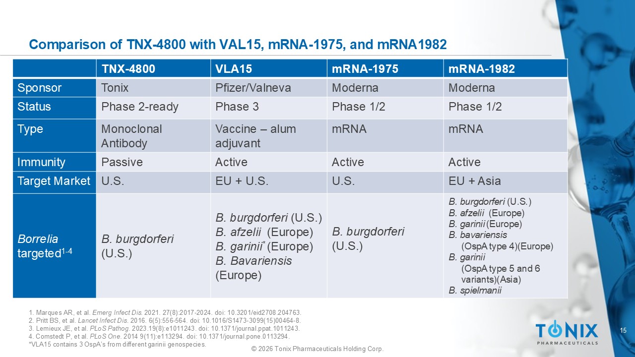 14 © 2026 Tonix Pharmaceuticals Holding Corp. Not All anti - OspA mAbs are Bactericidal 1. Embers ME, et al. Vaccine . 2026 75:128231. doi : 10.1016/j.vaccine.2026.128231. 2. Schiller ZA, et al. J Clin Invest . 2021;131(11):e144843. 3. LYMErix was full length OspA aa 20 - 273 from B. burgdorferi strain B31produced in E. Coli 4. VLA15 modifies the B31 OspA sequence to remove the putative arthritogenic/LFA - 1 – mimicking epitope (~aa 165 – 173) Bactericidal OspA Epitope 1,2 Name C - terminus Central Domain N - terminus Vaccine Antibody ~aa 165 – 173 - + 184.1 + + TNX - 4800 + + LA - 2 + + + + + LYMErix + + - + + VLA15 • Monoclonal anti - OspA antibodies can be bactericidal • In a series of mAbs , only those directed towards the C - terminal and central domains manifested bactericidal activity in vitro , and prevention of transmission in vivo 1 • For example, mAbs TNX - 4800 (2217) (central domain) 2 and LA - 2 ( C - terminal) are bactericidal • N - terminal anti - OspA antibodies can be inactive • 184.1 is an example of a non - bactericidal mAb that binds the N - terminal region