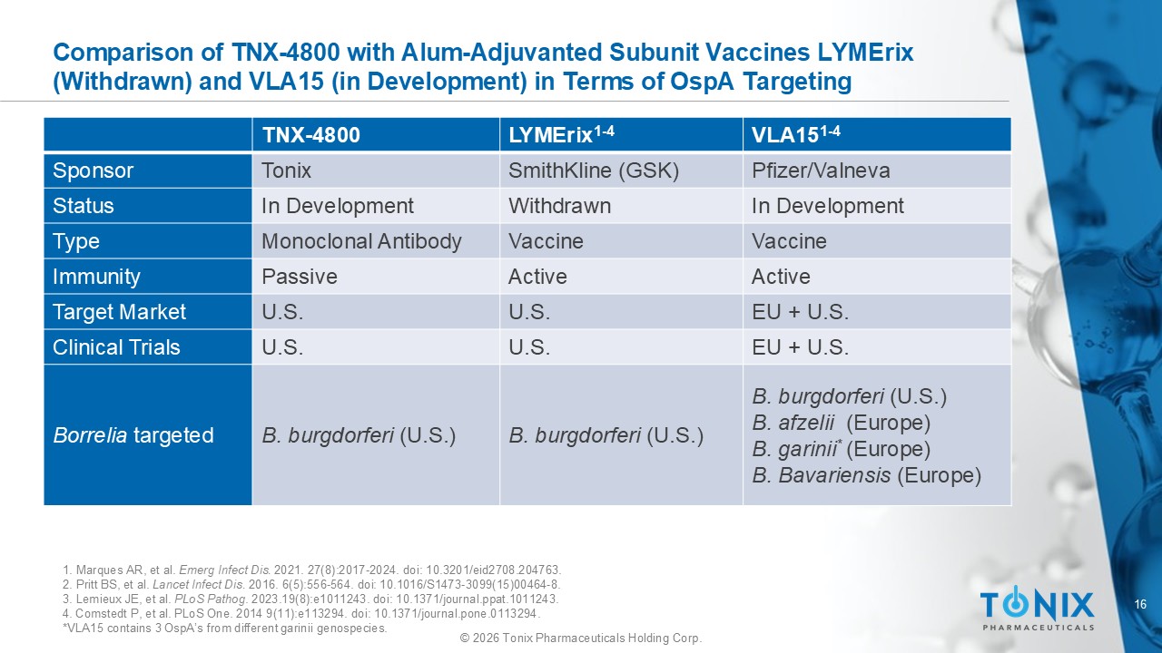 15 © 2026 Tonix Pharmaceuticals Holding Corp. Comparison of TNX - 4800 with VAL15, mRNA - 1975, and mRNA1982 1. Marques AR, et al. Emerg Infect Dis. 2021. 27(8):2017 - 2024. doi : 10.3201/eid2708.204763. 2. Pritt BS, et al. Lancet Infect Dis. 2016. 6(5):556 - 564. doi : 10.1016/S1473 - 3099(15)00464 - 8. 3. Lemieux JE, et al. PLoS Pathog . 2023.19(8):e1011243. doi : 10.1371/journal.ppat.1011243. 4. Comstedt P, et al. PLoS One . 2014 9(11):e113294. doi : 10.1371/journal.pone.0113294. *VLA15 contains 3 OspA’s from different garinii genospecies. mRNA - 1982 mRNA - 1975 VLA15 TNX - 4800 Moderna Moderna Pfizer/Valneva Tonix Sponsor Phase 1/2 Phase 1/2 Phase 3 Phase 2 - ready Status mRNA mRNA Vaccine – alum adjuvant Monoclonal Antibody Type Active Active Active Passive Immunity EU + Asia U.S. EU + U.S. U.S. Target Market B. burgdorferi (U.S.) B. afzelii (Europe) B. garinii (Europe) B. bavariensis ( OspA type 4) (Europe) B. garinii ( OspA type 5 and 6 variants)(Asia) B. spielmanii B. burgdorferi (U .S.) B. burgdorferi (U.S.) B. afzelii (Europe) B. garinii * (Europe) B. Bavariensis (Europe) B. burgdorferi (U .S.) Borrelia targeted 1 - 4
