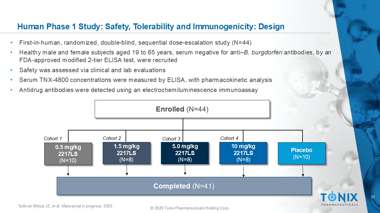 30 © 2026 Tonix Pharmaceuticals Holding Corp. TNX - 4800 Phase 1 Study Overview Primary Objective : • Evaluate safety and tolerability of a SC injection of TNX - 4800 (2217LS) when administered to healthy subjects Secondary Objective : • Evaluate pharmacokinetics of a SC dose of TNX - 4800 (2217LS) when administered to healthy subjects Study Population : • Healthy male and female subjects, age 19 to 65 years, inclusive