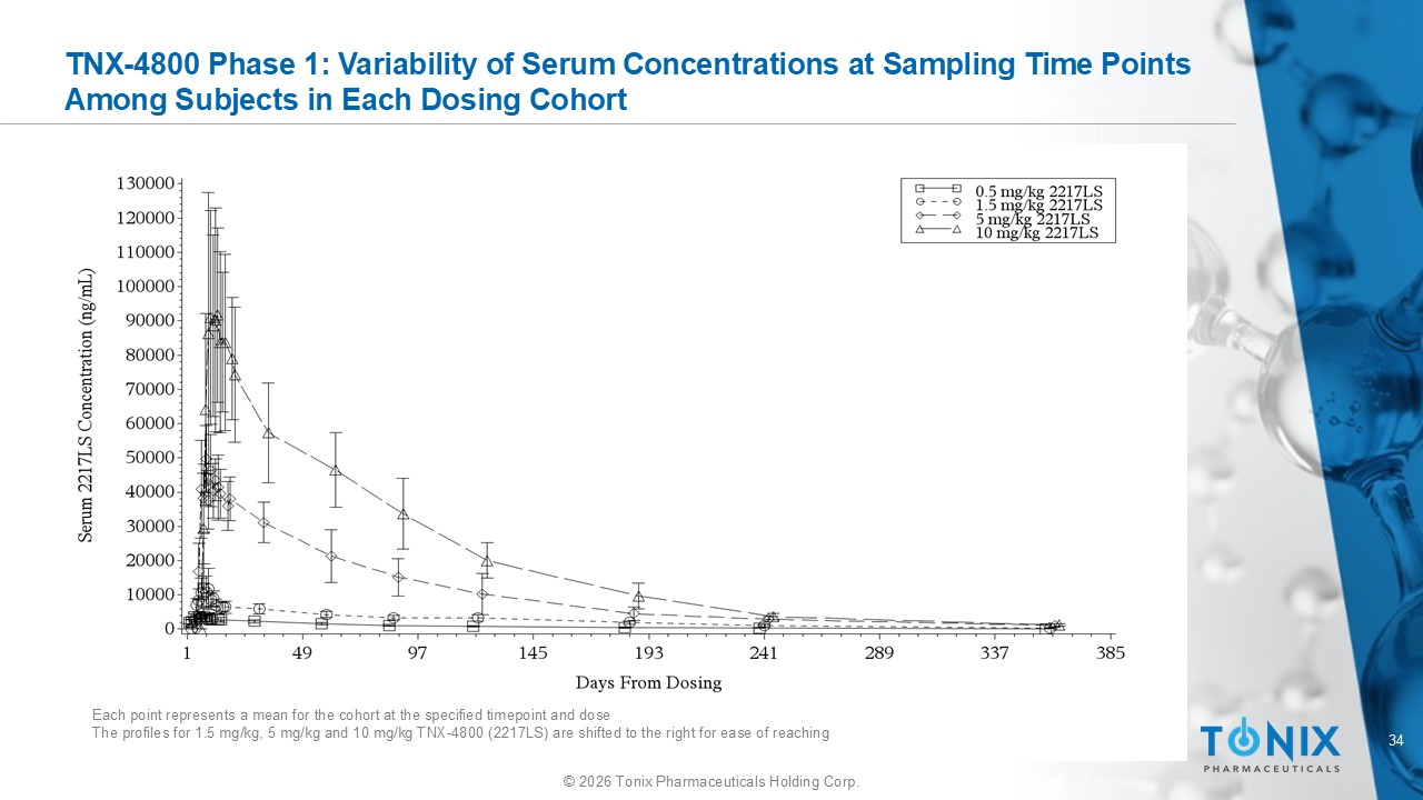 33 © 2026 Tonix Pharmaceuticals Holding Corp. Observed Phase 1 Pharmacokinetics 5 μ g/ml – in vitro ~10x EC 50 10 μ g/ml – in vitro MEC tick feeding 120 days 180 days Each point represents a mean for the cohort at the specified timepoint and dose