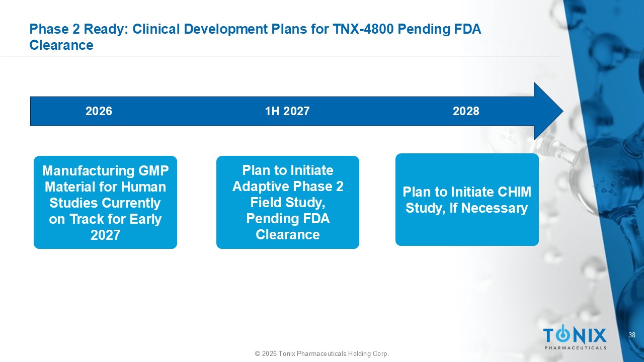 37 © 2026 Tonix Pharmaceuticals Holding Corp. Planned Phase 2 Field Trial • TNX - 4800 intended to be studied in an adaptive randomized, double - blind, placebo - controlled study, pending FDA clearance • Goal: To evaluate the efficacy and safety of TNX - 4800 in preventing the first occurrence of confirmed Lyme disease during the primary efficacy surveillance period (Day 3 through Month 4 following administration) • Inclusion: Adolescents and adults 16 to 65 years of age from Lyme - endemic areas in the U.S. • Primary endpoint: Prevention of Lyme disease at four months (comparison of TNX - 4800 group and placebo group) • Key secondary endpoint: Prevention of Lyme disease at six months (comparison of TNX - 4800 vs. placebo) • Dose: A single SC dose of placebo or TNX - 4800 350 mg • Rationale: TNX - 4800 5 mg/kg dose resulted in mean blood levels of 10 μ g/ml at four months 1 1. Average patient is assumed to be approximately 70kg.