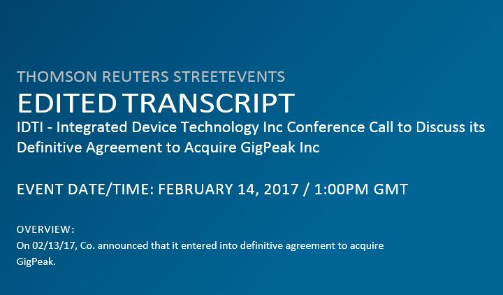 THOMSON REUTERS STREETEVENTS EDITED TRANSCRIPT IDTI - Integrated Device Technology Inc Conference Call to Discuss its Definitive Agreement to Acquire GigPeak Inc EVENT DATE/TIME: FEBRUARY 14, 2017 / 1:00PM GMT OVERVIEW: On 02/13/17, Co. announced that it entered into definitive agreement to acquire GigPeak.