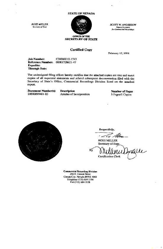 To the fullest extent permitted by NRS 78, a director or officer of the Corporation will not be personally liable to the Corporation or its stockholders for damages for breach of fiduciary duty as a director or officer, provided that this article will not eliminate or limit the liability of a director or officer for: