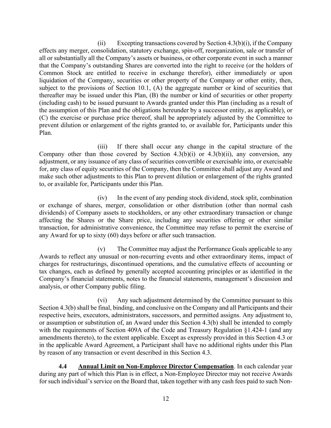 12 (ii) Excepting transactions covered by Section 4.3(b)(i), if the Company effects any merger, consolidation, statutory exchange, spin-off, reorganization, sale or transfer of all or substantially all the Company’s assets or business, or other corporate event in such a manner that the Company’s outstanding Shares are converted into the right to receive (or the holders of Common Stock are entitled to receive in exchange therefor), either immediately or upon liquidation of the Company, securities or other property of the Company or other entity, then, subject to the provisions of Section 10.1, (A) the aggregate number or kind of securities that thereafter may be issued under this Plan, (B) the number or kind of securities or other property (including cash) to be issued pursuant to Awards granted under this Plan (including as a result of the assumption of this Plan and the obligations hereunder by a successor entity, as applicable), or (C) the exercise or purchase price thereof, shall be appropriately adjusted by the Committee to prevent dilution or enlargement of the rights granted to, or available for, Participants under this Plan. (iii) If there shall occur any change in the capital structure of the Company other than those covered by Section 4.3(b)(i) or 4.3(b)(ii), any conversion, any adjustment, or any issuance of any class of securities convertible or exercisable into, or exercisable for, any class of equity securities of the Company, then the Committee shall adjust any Award and make such other adjustments to this Plan to prevent dilution or enlargement of the rights granted to, or available for, Participants under this Plan. (iv) In the event of any pending stock dividend, stock split, combination or exchange of shares, merger, consolidation or other distribution (other than normal cash dividends) of Company assets to stockholders, or any other extraordinary transaction or change affecting the Shares or the Share price, including any securities offering or other similar transaction, for administrative convenience, the Committee may refuse to permit the exercise of any Award for up to sixty (60) days before or after such transaction. (v) The Committee may adjust the Performance Goals applicable to any Awards to reflect any unusual or non-recurring events and other extraordinary items, impact of charges for restructurings, discontinued operations, and the cumulative effects of accounting or tax changes, each as defined by generally accepted accounting principles or as identified in the Company’s financial statements, notes to the financial statements, management’s discussion and analysis, or other Company public filing. (vi) Any such adjustment determined by the Committee pursuant to this Section 4.3(b) shall be final, binding, and conclusive on the Company and all Participants and their respective heirs, executors, administrators, successors, and permitted assigns. Any adjustment to, or assumption or substitution of, an Award under this Section 4.3(b) shall be intended to comply with the requirements of Section 409A of the Code and Treasury Regulation §1.424-1 (and any amendments thereto), to the extent applicable. Except as expressly provided in this Section 4.3 or in the applicable Award Agreement, a Participant shall have no additional rights under this Plan by reason of any transaction or event described in this Section 4.3. 4.4 Annual Limit on Non-Employee Director Compensation. In each calendar year during any part of which this Plan is in effect, a Non-Employee Director may not receive Awards for such individual’s service on the Board that, taken together with any cash fees paid to such Non-
