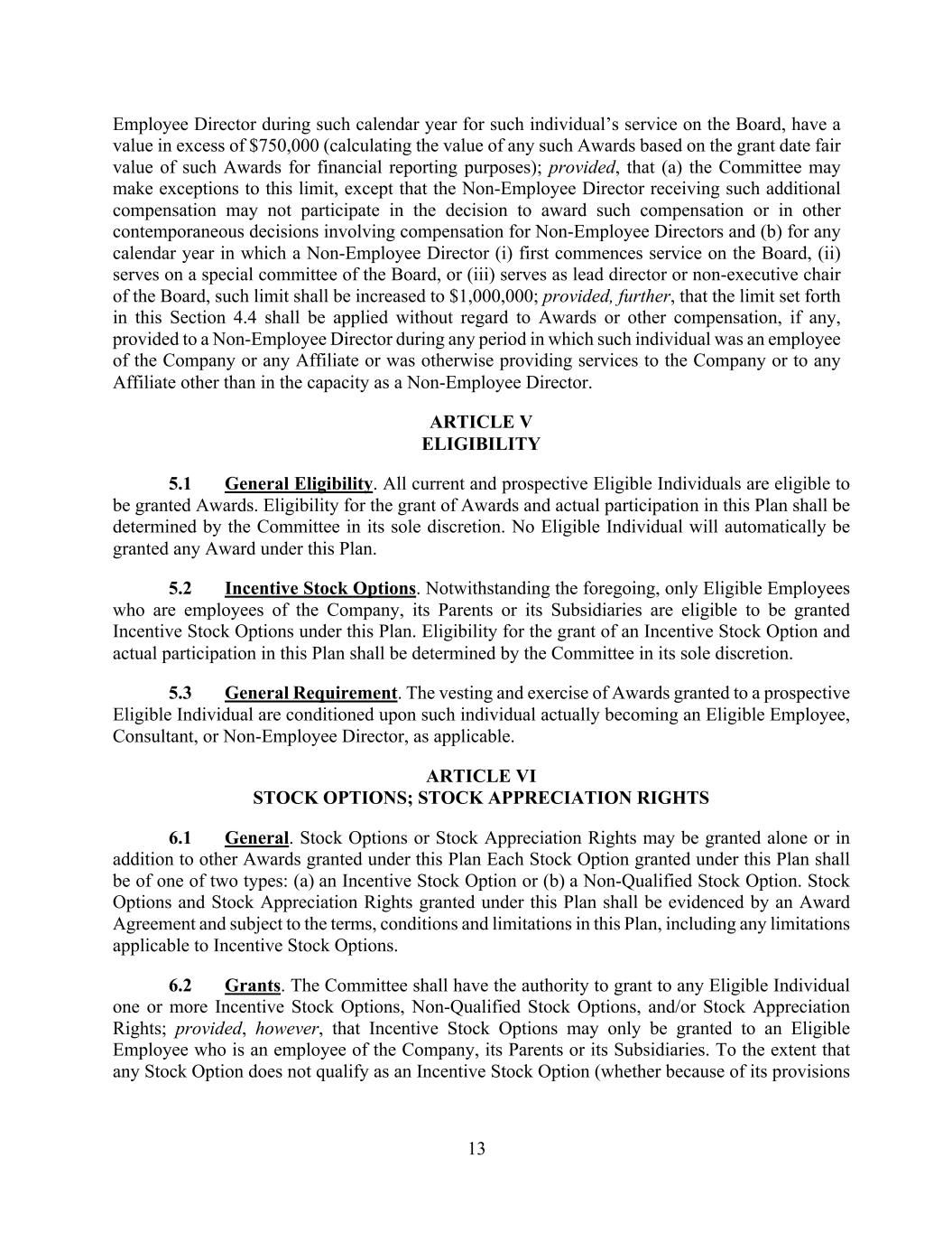 13 Employee Director during such calendar year for such individual’s service on the Board, have a value in excess of $750,000 (calculating the value of any such Awards based on the grant date fair value of such Awards for financial reporting purposes); provided, that (a) the Committee may make exceptions to this limit, except that the Non-Employee Director receiving such additional compensation may not participate in the decision to award such compensation or in other contemporaneous decisions involving compensation for Non-Employee Directors and (b) for any calendar year in which a Non-Employee Director (i) first commences service on the Board, (ii) serves on a special committee of the Board, or (iii) serves as lead director or non-executive chair of the Board, such limit shall be increased to $1,000,000; provided, further, that the limit set forth in this Section 4.4 shall be applied without regard to Awards or other compensation, if any, provided to a Non-Employee Director during any period in which such individual was an employee of the Company or any Affiliate or was otherwise providing services to the Company or to any Affiliate other than in the capacity as a Non-Employee Director. ARTICLE V ELIGIBILITY 5.1 General Eligibility. All current and prospective Eligible Individuals are eligible to be granted Awards. Eligibility for the grant of Awards and actual participation in this Plan shall be determined by the Committee in its sole discretion. No Eligible Individual will automatically be granted any Award under this Plan. 5.2 Incentive Stock Options. Notwithstanding the foregoing, only Eligible Employees who are employees of the Company, its Parents or its Subsidiaries are eligible to be granted Incentive Stock Options under this Plan. Eligibility for the grant of an Incentive Stock Option and actual participation in this Plan shall be determined by the Committee in its sole discretion. 5.3 General Requirement. The vesting and exercise of Awards granted to a prospective Eligible Individual are conditioned upon such individual actually becoming an Eligible Employee, Consultant, or Non-Employee Director, as applicable. ARTICLE VI STOCK OPTIONS; STOCK APPRECIATION RIGHTS 6.1 General. Stock Options or Stock Appreciation Rights may be granted alone or in addition to other Awards granted under this Plan Each Stock Option granted under this Plan shall be of one of two types: (a) an Incentive Stock Option or (b) a Non-Qualified Stock Option. Stock Options and Stock Appreciation Rights granted under this Plan shall be evidenced by an Award Agreement and subject to the terms, conditions and limitations in this Plan, including any limitations applicable to Incentive Stock Options. 6.2 Grants. The Committee shall have the authority to grant to any Eligible Individual one or more Incentive Stock Options, Non-Qualified Stock Options, and/or Stock Appreciation Rights; provided, however, that Incentive Stock Options may only be granted to an Eligible Employee who is an employee of the Company, its Parents or its Subsidiaries. To the extent that any Stock Option does not qualify as an Incentive Stock Option (whether because of its provisions