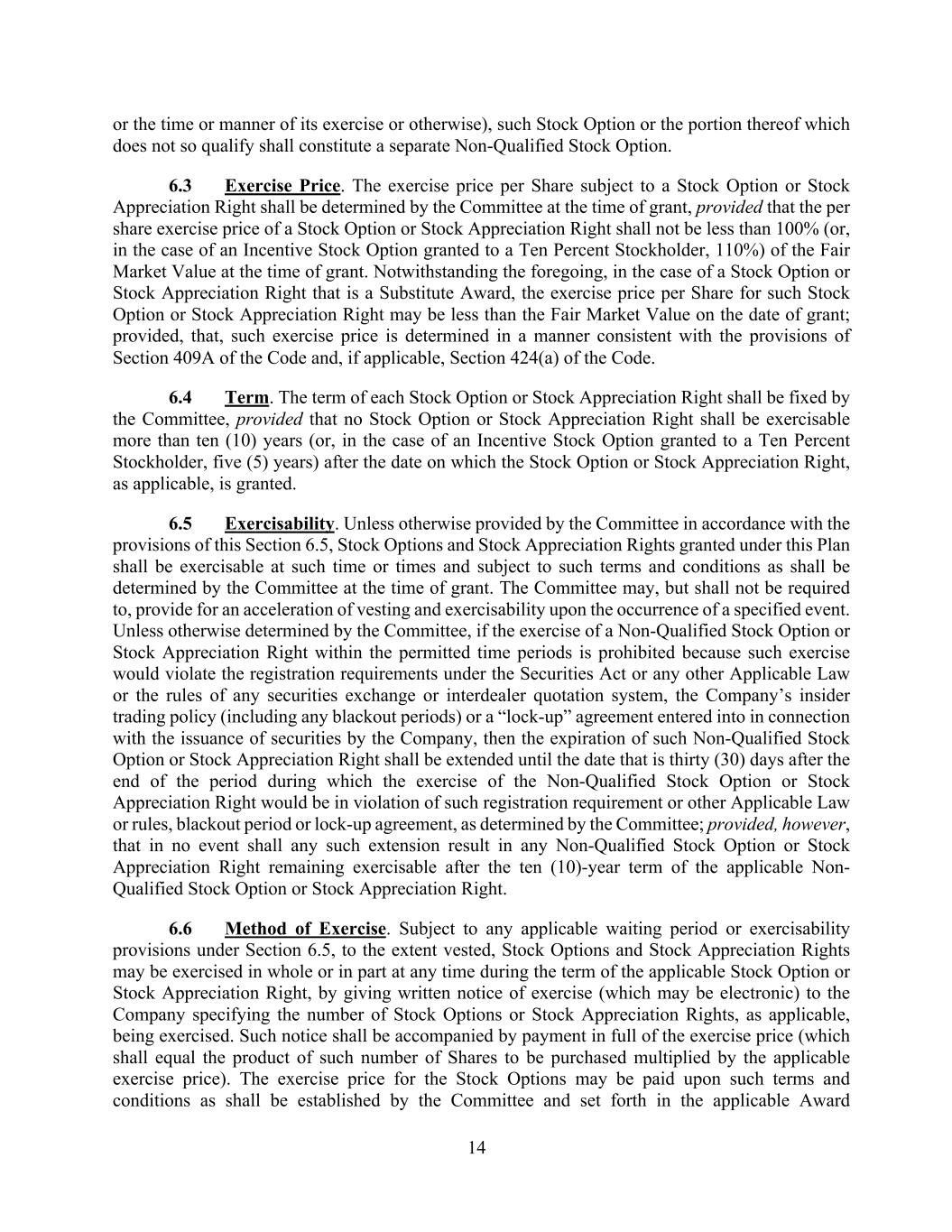 14 or the time or manner of its exercise or otherwise), such Stock Option or the portion thereof which does not so qualify shall constitute a separate Non-Qualified Stock Option. 6.3 Exercise Price. The exercise price per Share subject to a Stock Option or Stock Appreciation Right shall be determined by the Committee at the time of grant, provided that the per share exercise price of a Stock Option or Stock Appreciation Right shall not be less than 100% (or, in the case of an Incentive Stock Option granted to a Ten Percent Stockholder, 110%) of the Fair Market Value at the time of grant. Notwithstanding the foregoing, in the case of a Stock Option or Stock Appreciation Right that is a Substitute Award, the exercise price per Share for such Stock Option or Stock Appreciation Right may be less than the Fair Market Value on the date of grant; provided, that, such exercise price is determined in a manner consistent with the provisions of Section 409A of the Code and, if applicable, Section 424(a) of the Code. 6.4 Term. The term of each Stock Option or Stock Appreciation Right shall be fixed by the Committee, provided that no Stock Option or Stock Appreciation Right shall be exercisable more than ten (10) years (or, in the case of an Incentive Stock Option granted to a Ten Percent Stockholder, five (5) years) after the date on which the Stock Option or Stock Appreciation Right, as applicable, is granted. 6.5 Exercisability. Unless otherwise provided by the Committee in accordance with the provisions of this Section 6.5, Stock Options and Stock Appreciation Rights granted under this Plan shall be exercisable at such time or times and subject to such terms and conditions as shall be determined by the Committee at the time of grant. The Committee may, but shall not be required to, provide for an acceleration of vesting and exercisability upon the occurrence of a specified event. Unless otherwise determined by the Committee, if the exercise of a Non-Qualified Stock Option or Stock Appreciation Right within the permitted time periods is prohibited because such exercise would violate the registration requirements under the Securities Act or any other Applicable Law or the rules of any securities exchange or interdealer quotation system, the Company’s insider trading policy (including any blackout periods) or a “lock-up” agreement entered into in connection with the issuance of securities by the Company, then the expiration of such Non-Qualified Stock Option or Stock Appreciation Right shall be extended until the date that is thirty (30) days after the end of the period during which the exercise of the Non-Qualified Stock Option or Stock Appreciation Right would be in violation of such registration requirement or other Applicable Law or rules, blackout period or lock-up agreement, as determined by the Committee; provided, however, that in no event shall any such extension result in any Non-Qualified Stock Option or Stock Appreciation Right remaining exercisable after the ten (10)-year term of the applicable Non- Qualified Stock Option or Stock Appreciation Right. 6.6 Method of Exercise. Subject to any applicable waiting period or exercisability provisions under Section 6.5, to the extent vested, Stock Options and Stock Appreciation Rights may be exercised in whole or in part at any time during the term of the applicable Stock Option or Stock Appreciation Right, by giving written notice of exercise (which may be electronic) to the Company specifying the number of Stock Options or Stock Appreciation Rights, as applicable, being exercised. Such notice shall be accompanied by payment in full of the exercise price (which shall equal the product of such number of Shares to be purchased multiplied by the applicable exercise price). The exercise price for the Stock Options may be paid upon such terms and conditions as shall be established by the Committee and set forth in the applicable Award