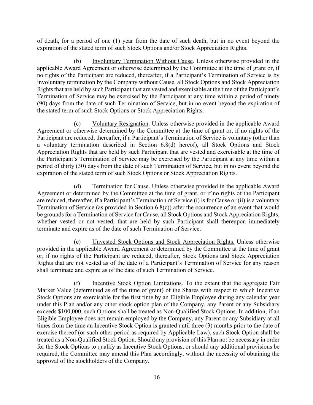 16 of death, for a period of one (1) year from the date of such death, but in no event beyond the expiration of the stated term of such Stock Options and/or Stock Appreciation Rights. (b) Involuntary Termination Without Cause. Unless otherwise provided in the applicable Award Agreement or otherwise determined by the Committee at the time of grant or, if no rights of the Participant are reduced, thereafter, if a Participant’s Termination of Service is by involuntary termination by the Company without Cause, all Stock Options and Stock Appreciation Rights that are held by such Participant that are vested and exercisable at the time of the Participant’s Termination of Service may be exercised by the Participant at any time within a period of ninety (90) days from the date of such Termination of Service, but in no event beyond the expiration of the stated term of such Stock Options or Stock Appreciation Rights. (c) Voluntary Resignation. Unless otherwise provided in the applicable Award Agreement or otherwise determined by the Committee at the time of grant or, if no rights of the Participant are reduced, thereafter, if a Participant’s Termination of Service is voluntary (other than a voluntary termination described in Section 6.8(d) hereof), all Stock Options and Stock Appreciation Rights that are held by such Participant that are vested and exercisable at the time of the Participant’s Termination of Service may be exercised by the Participant at any time within a period of thirty (30) days from the date of such Termination of Service, but in no event beyond the expiration of the stated term of such Stock Options or Stock Appreciation Rights. (d) Termination for Cause. Unless otherwise provided in the applicable Award Agreement or determined by the Committee at the time of grant, or if no rights of the Participant are reduced, thereafter, if a Participant’s Termination of Service (i) is for Cause or (ii) is a voluntary Termination of Service (as provided in Section 6.8(c)) after the occurrence of an event that would be grounds for a Termination of Service for Cause, all Stock Options and Stock Appreciation Rights, whether vested or not vested, that are held by such Participant shall thereupon immediately terminate and expire as of the date of such Termination of Service. (e) Unvested Stock Options and Stock Appreciation Rights. Unless otherwise provided in the applicable Award Agreement or determined by the Committee at the time of grant or, if no rights of the Participant are reduced, thereafter, Stock Options and Stock Appreciation Rights that are not vested as of the date of a Participant’s Termination of Service for any reason shall terminate and expire as of the date of such Termination of Service. (f) Incentive Stock Option Limitations. To the extent that the aggregate Fair Market Value (determined as of the time of grant) of the Shares with respect to which Incentive Stock Options are exercisable for the first time by an Eligible Employee during any calendar year under this Plan and/or any other stock option plan of the Company, any Parent or any Subsidiary exceeds $100,000, such Options shall be treated as Non-Qualified Stock Options. In addition, if an Eligible Employee does not remain employed by the Company, any Parent or any Subsidiary at all times from the time an Incentive Stock Option is granted until three (3) months prior to the date of exercise thereof (or such other period as required by Applicable Law), such Stock Option shall be treated as a Non-Qualified Stock Option. Should any provision of this Plan not be necessary in order for the Stock Options to qualify as Incentive Stock Options, or should any additional provisions be required, the Committee may amend this Plan accordingly, without the necessity of obtaining the approval of the stockholders of the Company.