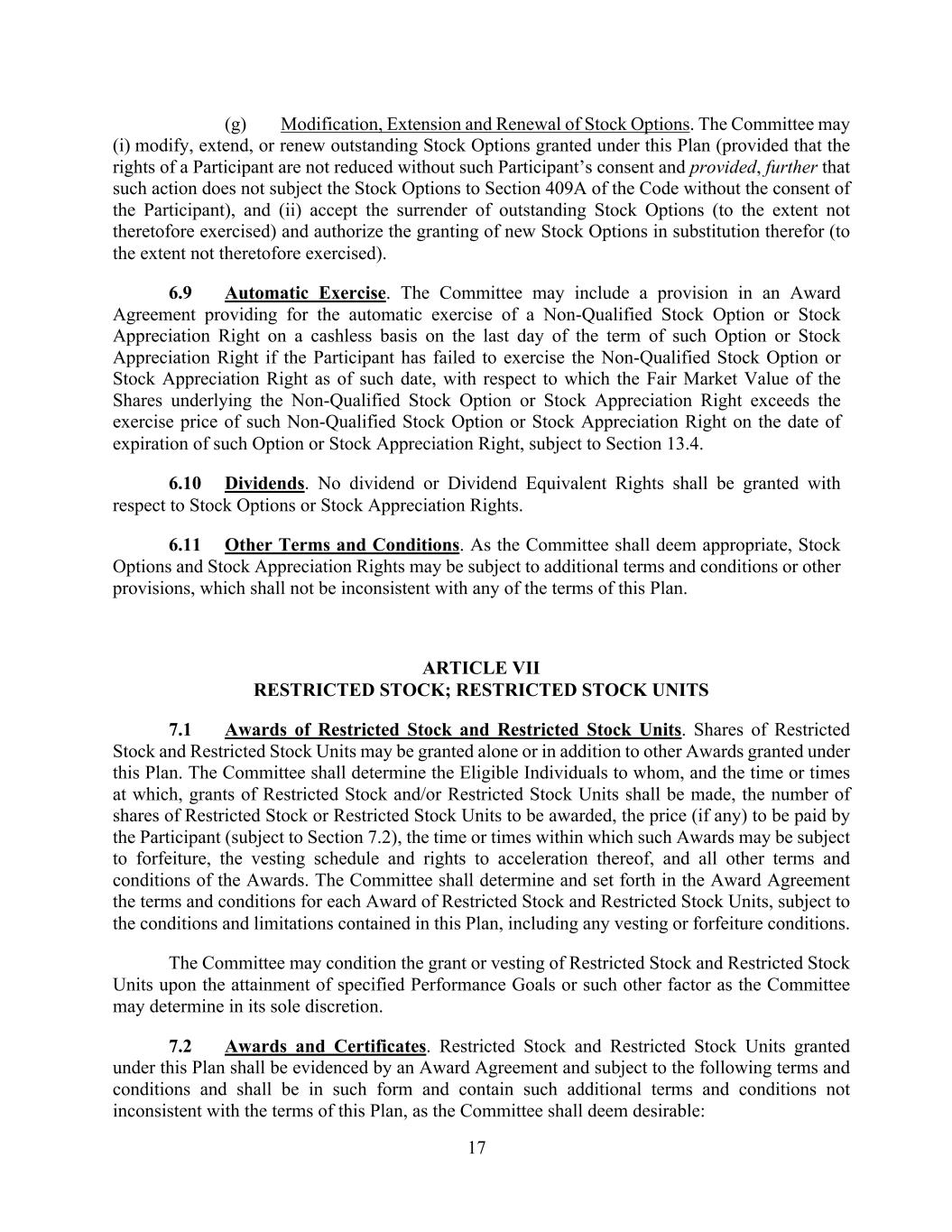 17 (g) Modification, Extension and Renewal of Stock Options. The Committee may (i) modify, extend, or renew outstanding Stock Options granted under this Plan (provided that the rights of a Participant are not reduced without such Participant’s consent and provided, further that such action does not subject the Stock Options to Section 409A of the Code without the consent of the Participant), and (ii) accept the surrender of outstanding Stock Options (to the extent not theretofore exercised) and authorize the granting of new Stock Options in substitution therefor (to the extent not theretofore exercised). 6.9 Automatic Exercise. The Committee may include a provision in an Award Agreement providing for the automatic exercise of a Non-Qualified Stock Option or Stock Appreciation Right on a cashless basis on the last day of the term of such Option or Stock Appreciation Right if the Participant has failed to exercise the Non-Qualified Stock Option or Stock Appreciation Right as of such date, with respect to which the Fair Market Value of the Shares underlying the Non-Qualified Stock Option or Stock Appreciation Right exceeds the exercise price of such Non-Qualified Stock Option or Stock Appreciation Right on the date of expiration of such Option or Stock Appreciation Right, subject to Section 13.4. 6.10 Dividends. No dividend or Dividend Equivalent Rights shall be granted with respect to Stock Options or Stock Appreciation Rights. 6.11 Other Terms and Conditions. As the Committee shall deem appropriate, Stock Options and Stock Appreciation Rights may be subject to additional terms and conditions or other provisions, which shall not be inconsistent with any of the terms of this Plan. ARTICLE VII RESTRICTED STOCK; RESTRICTED STOCK UNITS 7.1 Awards of Restricted Stock and Restricted Stock Units. Shares of Restricted Stock and Restricted Stock Units may be granted alone or in addition to other Awards granted under this Plan. The Committee shall determine the Eligible Individuals to whom, and the time or times at which, grants of Restricted Stock and/or Restricted Stock Units shall be made, the number of shares of Restricted Stock or Restricted Stock Units to be awarded, the price (if any) to be paid by the Participant (subject to Section 7.2), the time or times within which such Awards may be subject to forfeiture, the vesting schedule and rights to acceleration thereof, and all other terms and conditions of the Awards. The Committee shall determine and set forth in the Award Agreement the terms and conditions for each Award of Restricted Stock and Restricted Stock Units, subject to the conditions and limitations contained in this Plan, including any vesting or forfeiture conditions. The Committee may condition the grant or vesting of Restricted Stock and Restricted Stock Units upon the attainment of specified Performance Goals or such other factor as the Committee may determine in its sole discretion. 7.2 Awards and Certificates. Restricted Stock and Restricted Stock Units granted under this Plan shall be evidenced by an Award Agreement and subject to the following terms and conditions and shall be in such form and contain such additional terms and conditions not inconsistent with the terms of this Plan, as the Committee shall deem desirable: