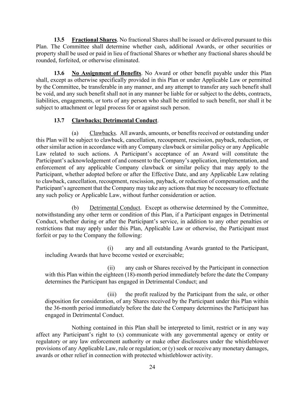 24 13.5 Fractional Shares. No fractional Shares shall be issued or delivered pursuant to this Plan. The Committee shall determine whether cash, additional Awards, or other securities or property shall be used or paid in lieu of fractional Shares or whether any fractional shares should be rounded, forfeited, or otherwise eliminated. 13.6 No Assignment of Benefits. No Award or other benefit payable under this Plan shall, except as otherwise specifically provided in this Plan or under Applicable Law or permitted by the Committee, be transferable in any manner, and any attempt to transfer any such benefit shall be void, and any such benefit shall not in any manner be liable for or subject to the debts, contracts, liabilities, engagements, or torts of any person who shall be entitled to such benefit, nor shall it be subject to attachment or legal process for or against such person. 13.7 Clawbacks; Detrimental Conduct. (a) Clawbacks. All awards, amounts, or benefits received or outstanding under this Plan will be subject to clawback, cancellation, recoupment, rescission, payback, reduction, or other similar action in accordance with any Company clawback or similar policy or any Applicable Law related to such actions. A Participant’s acceptance of an Award will constitute the Participant’s acknowledgement of and consent to the Company’s application, implementation, and enforcement of any applicable Company clawback or similar policy that may apply to the Participant, whether adopted before or after the Effective Date, and any Applicable Law relating to clawback, cancellation, recoupment, rescission, payback, or reduction of compensation, and the Participant’s agreement that the Company may take any actions that may be necessary to effectuate any such policy or Applicable Law, without further consideration or action. (b) Detrimental Conduct. Except as otherwise determined by the Committee, notwithstanding any other term or condition of this Plan, if a Participant engages in Detrimental Conduct, whether during or after the Participant’s service, in addition to any other penalties or restrictions that may apply under this Plan, Applicable Law or otherwise, the Participant must forfeit or pay to the Company the following: (i) any and all outstanding Awards granted to the Participant, including Awards that have become vested or exercisable; (ii) any cash or Shares received by the Participant in connection with this Plan within the eighteen (18)-month period immediately before the date the Company determines the Participant has engaged in Detrimental Conduct; and (iii) the profit realized by the Participant from the sale, or other disposition for consideration, of any Shares received by the Participant under this Plan within the 36-month period immediately before the date the Company determines the Participant has engaged in Detrimental Conduct. Nothing contained in this Plan shall be interpreted to limit, restrict or in any way affect any Participant’s right to (x) communicate with any governmental agency or entity or regulatory or any law enforcement authority or make other disclosures under the whistleblower provisions of any Applicable Law, rule or regulation; or (y) seek or receive any monetary damages, awards or other relief in connection with protected whistleblower activity.