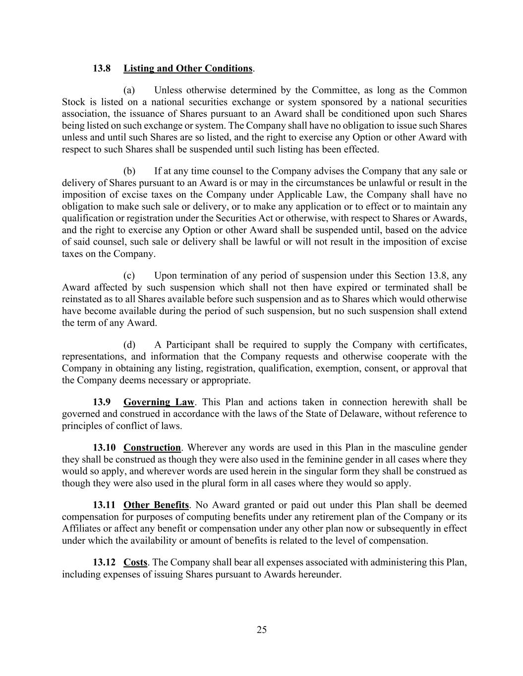 25 13.8 Listing and Other Conditions. (a) Unless otherwise determined by the Committee, as long as the Common Stock is listed on a national securities exchange or system sponsored by a national securities association, the issuance of Shares pursuant to an Award shall be conditioned upon such Shares being listed on such exchange or system. The Company shall have no obligation to issue such Shares unless and until such Shares are so listed, and the right to exercise any Option or other Award with respect to such Shares shall be suspended until such listing has been effected. (b) If at any time counsel to the Company advises the Company that any sale or delivery of Shares pursuant to an Award is or may in the circumstances be unlawful or result in the imposition of excise taxes on the Company under Applicable Law, the Company shall have no obligation to make such sale or delivery, or to make any application or to effect or to maintain any qualification or registration under the Securities Act or otherwise, with respect to Shares or Awards, and the right to exercise any Option or other Award shall be suspended until, based on the advice of said counsel, such sale or delivery shall be lawful or will not result in the imposition of excise taxes on the Company. (c) Upon termination of any period of suspension under this Section 13.8, any Award affected by such suspension which shall not then have expired or terminated shall be reinstated as to all Shares available before such suspension and as to Shares which would otherwise have become available during the period of such suspension, but no such suspension shall extend the term of any Award. (d) A Participant shall be required to supply the Company with certificates, representations, and information that the Company requests and otherwise cooperate with the Company in obtaining any listing, registration, qualification, exemption, consent, or approval that the Company deems necessary or appropriate. 13.9 Governing Law. This Plan and actions taken in connection herewith shall be governed and construed in accordance with the laws of the State of Delaware, without reference to principles of conflict of laws. 13.10 Construction. Wherever any words are used in this Plan in the masculine gender they shall be construed as though they were also used in the feminine gender in all cases where they would so apply, and wherever words are used herein in the singular form they shall be construed as though they were also used in the plural form in all cases where they would so apply. 13.11 Other Benefits. No Award granted or paid out under this Plan shall be deemed compensation for purposes of computing benefits under any retirement plan of the Company or its Affiliates or affect any benefit or compensation under any other plan now or subsequently in effect under which the availability or amount of benefits is related to the level of compensation. 13.12 Costs. The Company shall bear all expenses associated with administering this Plan, including expenses of issuing Shares pursuant to Awards hereunder.