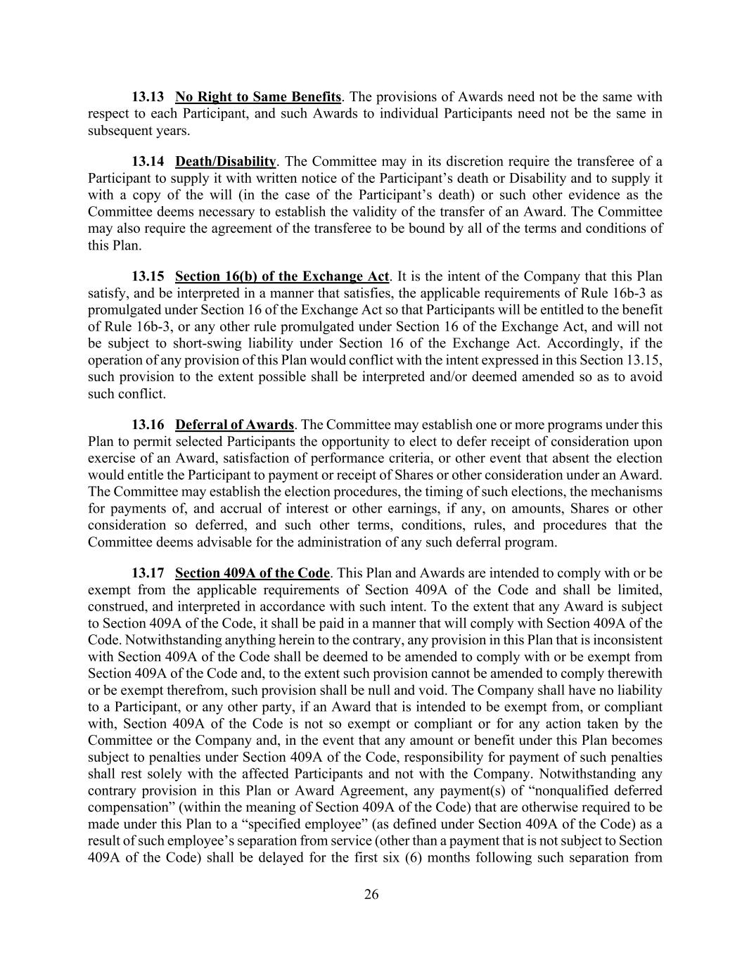 26 13.13 No Right to Same Benefits. The provisions of Awards need not be the same with respect to each Participant, and such Awards to individual Participants need not be the same in subsequent years. 13.14 Death/Disability. The Committee may in its discretion require the transferee of a Participant to supply it with written notice of the Participant’s death or Disability and to supply it with a copy of the will (in the case of the Participant’s death) or such other evidence as the Committee deems necessary to establish the validity of the transfer of an Award. The Committee may also require the agreement of the transferee to be bound by all of the terms and conditions of this Plan. 13.15 Section 16(b) of the Exchange Act. It is the intent of the Company that this Plan satisfy, and be interpreted in a manner that satisfies, the applicable requirements of Rule 16b-3 as promulgated under Section 16 of the Exchange Act so that Participants will be entitled to the benefit of Rule 16b-3, or any other rule promulgated under Section 16 of the Exchange Act, and will not be subject to short-swing liability under Section 16 of the Exchange Act. Accordingly, if the operation of any provision of this Plan would conflict with the intent expressed in this Section 13.15, such provision to the extent possible shall be interpreted and/or deemed amended so as to avoid such conflict. 13.16 Deferral of Awards. The Committee may establish one or more programs under this Plan to permit selected Participants the opportunity to elect to defer receipt of consideration upon exercise of an Award, satisfaction of performance criteria, or other event that absent the election would entitle the Participant to payment or receipt of Shares or other consideration under an Award. The Committee may establish the election procedures, the timing of such elections, the mechanisms for payments of, and accrual of interest or other earnings, if any, on amounts, Shares or other consideration so deferred, and such other terms, conditions, rules, and procedures that the Committee deems advisable for the administration of any such deferral program. 13.17 Section 409A of the Code. This Plan and Awards are intended to comply with or be exempt from the applicable requirements of Section 409A of the Code and shall be limited, construed, and interpreted in accordance with such intent. To the extent that any Award is subject to Section 409A of the Code, it shall be paid in a manner that will comply with Section 409A of the Code. Notwithstanding anything herein to the contrary, any provision in this Plan that is inconsistent with Section 409A of the Code shall be deemed to be amended to comply with or be exempt from Section 409A of the Code and, to the extent such provision cannot be amended to comply therewith or be exempt therefrom, such provision shall be null and void. The Company shall have no liability to a Participant, or any other party, if an Award that is intended to be exempt from, or compliant with, Section 409A of the Code is not so exempt or compliant or for any action taken by the Committee or the Company and, in the event that any amount or benefit under this Plan becomes subject to penalties under Section 409A of the Code, responsibility for payment of such penalties shall rest solely with the affected Participants and not with the Company. Notwithstanding any contrary provision in this Plan or Award Agreement, any payment(s) of “nonqualified deferred compensation” (within the meaning of Section 409A of the Code) that are otherwise required to be made under this Plan to a “specified employee” (as defined under Section 409A of the Code) as a result of such employee’s separation from service (other than a payment that is not subject to Section 409A of the Code) shall be delayed for the first six (6) months following such separation from